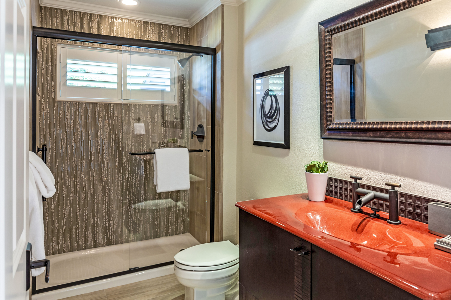 This lovely home contains a large primary bedroom suite with a remodeled bath and two walk-in closets. There is a spacious guest room, office, and an elegant powder room. The living room features white beamed cathedral ceilings, gas fireplace with stone hearth, and tranquil landscape views. The dining room has direct access to the private deck and is adjacent to the remodeled kitchen. An open family room overlooks the living room and is adjacent to the kitchen. There is a separate laundry room and attached oversized two-car garage with ample built-in storage.