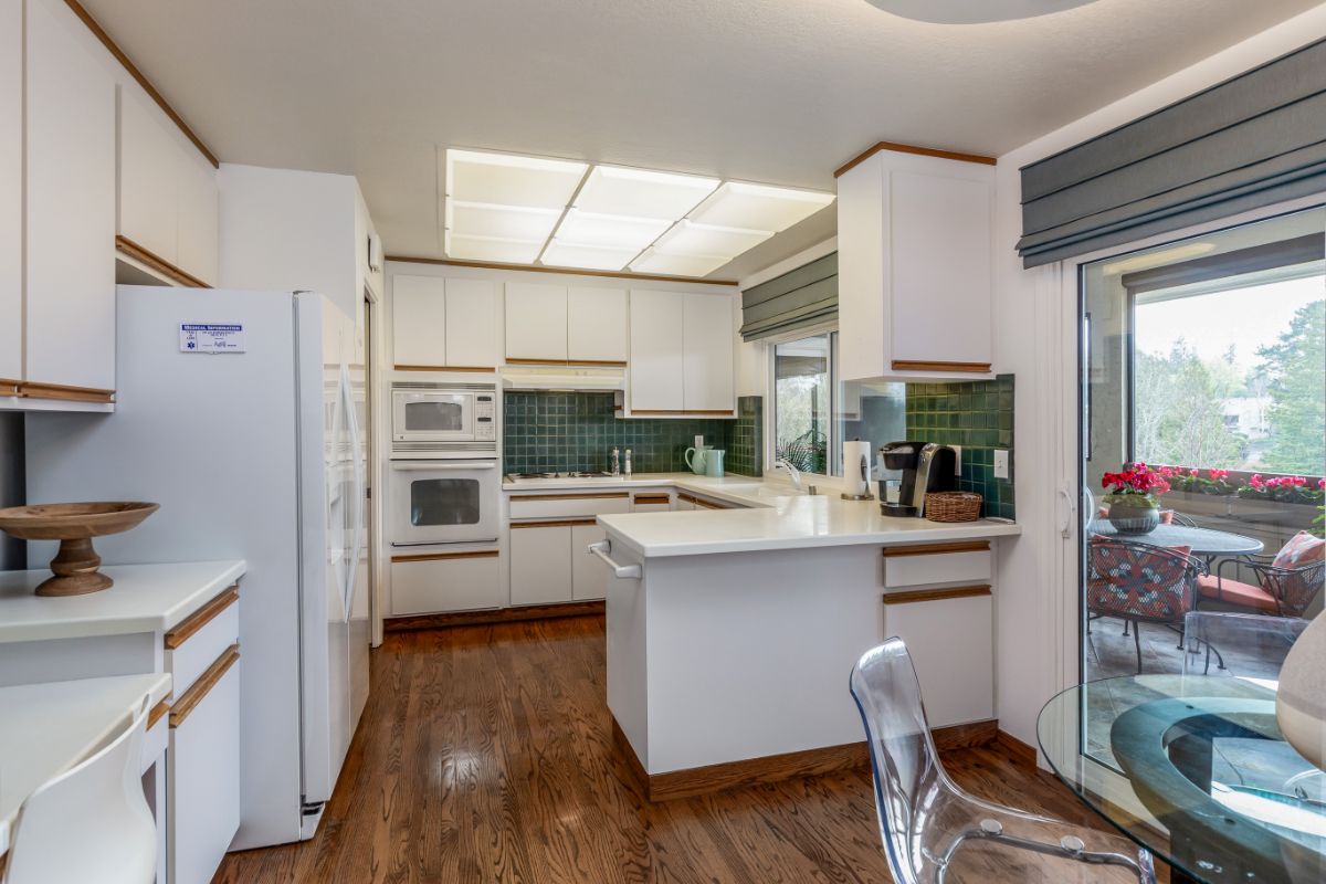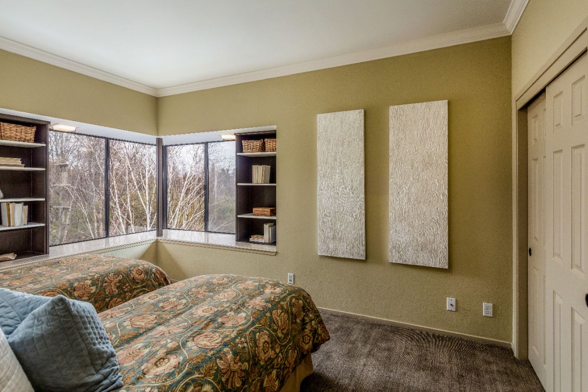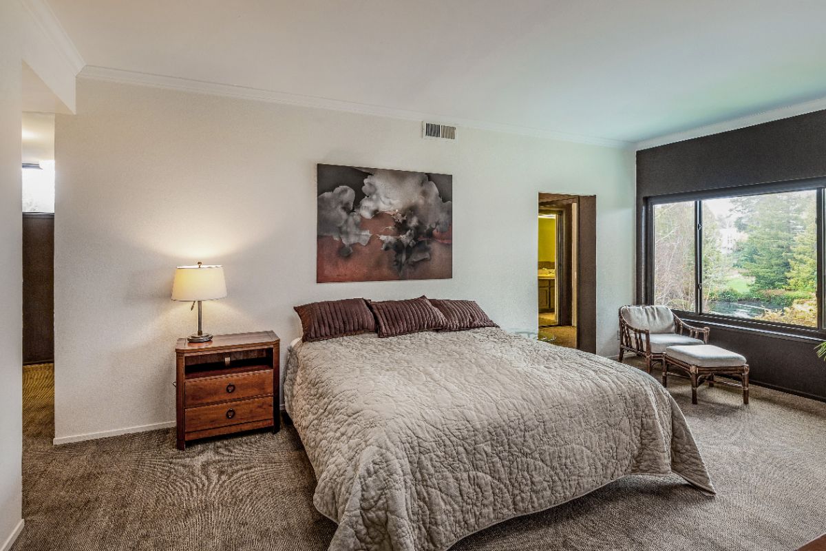 Enjoy tranquil, easy living in this gated, prestigious Sharon Heights community. Situated in a spacious and airy top-floor corner unit, this home offers serene tree-top, golf course, and western hill views. The interiors were designed by internationally acclaimed San Francisco designer John Wheatman using richly hued wall colors, mirror, and extensive built-ins. The result is sophisticated and chic.