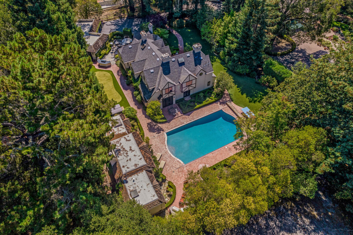 Welcome to this classic English Tudor manor with roots dating back to 1936, stylishly updated interiors, resort-inspired grounds, and a spacious guest house. Providing seclusion and privacy, a long driveway leads you to this captivating property introduced through columns topped with stone-carved pineapple finals – a signature of friendship and hospitality. Towering redwoods and a colorful rose garden enhance the setting while vast stretches of synthetic lawn wrap the entire home with thoughtful consideration for today’s drought conditions.