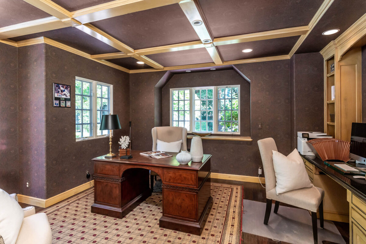 The main residence is beautifully appointed with classic and timeless finishes that include hewn-finished hardwood floors on the main level, leaded glass accent windows, and refined millwork. Traditional formal venues are complemented by a kitchen and adjoining family room that is perfect for today’s style of living. There is also a handsomely appointed library/office with outside entrance that is just right for today’s work-from-home needs. Rounding out the main level is a spacious, bright and light bedroom suite with pool access. Upstairs, the home’s three additional bedrooms include the primary suite, which spans one entire side of the home and features tremendous customized wardrobe space and an all-marble luxe bath. Adding to the accommodations is a large 1-bedroom, 1-bath guest house with full kitchen that doubles as a poolside entertainment venue.