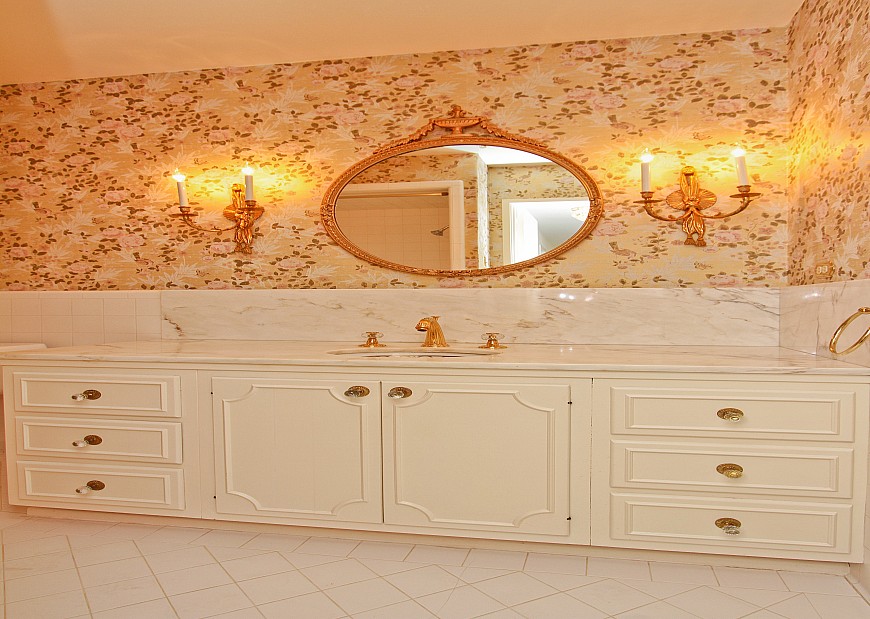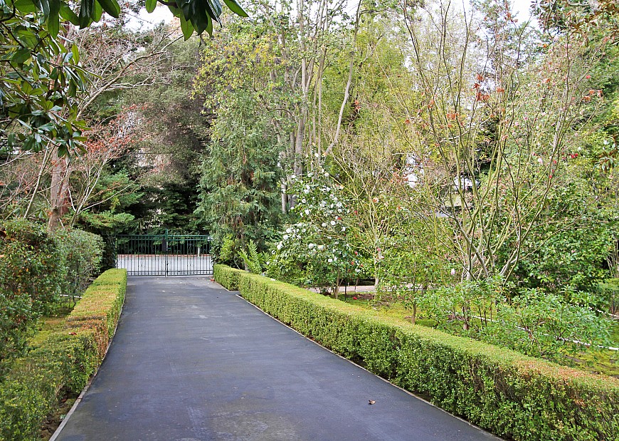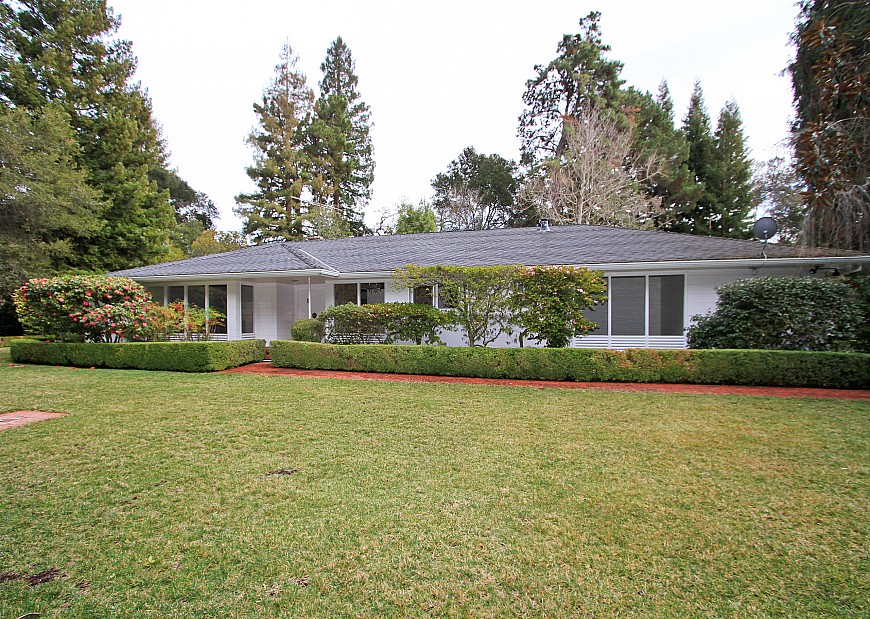 Nestled within a lovely garden setting, this bright and inviting 3 bedroom, 4 bath ranch home is surrounded by a verdant backdrop of redwood and magnolia trees. Located down a private gated driveway, the house is surrounded by brick pathways, skirting along lush lawns and colorful gardens. The spacious home offers beautiful views of the yard from almost every room. Double doors open to the entry hall leading past a cozy, eat-in kitchen to the living room with fireplace, formal dining area and large enclosed patio at the rear of the home. Large windows and sliding glass doors afford gorgeous views of the back yard and promote an indoor-outdoor lifestyle. The family room and adjacent den/office are spacious and light-filled, providing a warm, inviting refuge. The generous master suite features tall windows, ample storage including a large walk-in closet, and an attached bathroom. The second and third bedrooms also have tall windows and feature en-suite baths