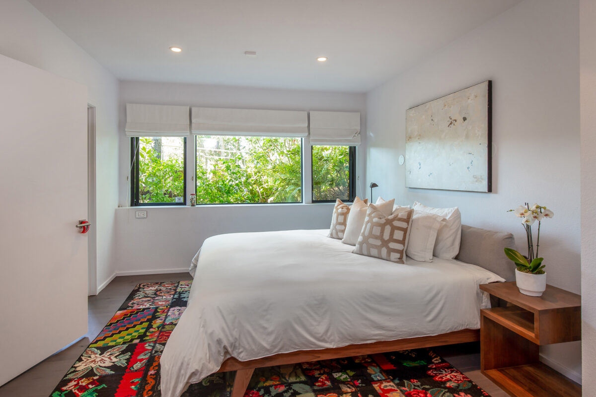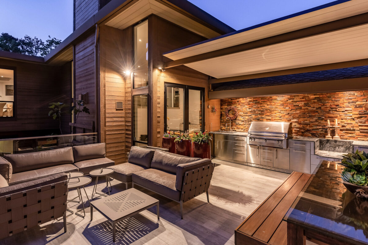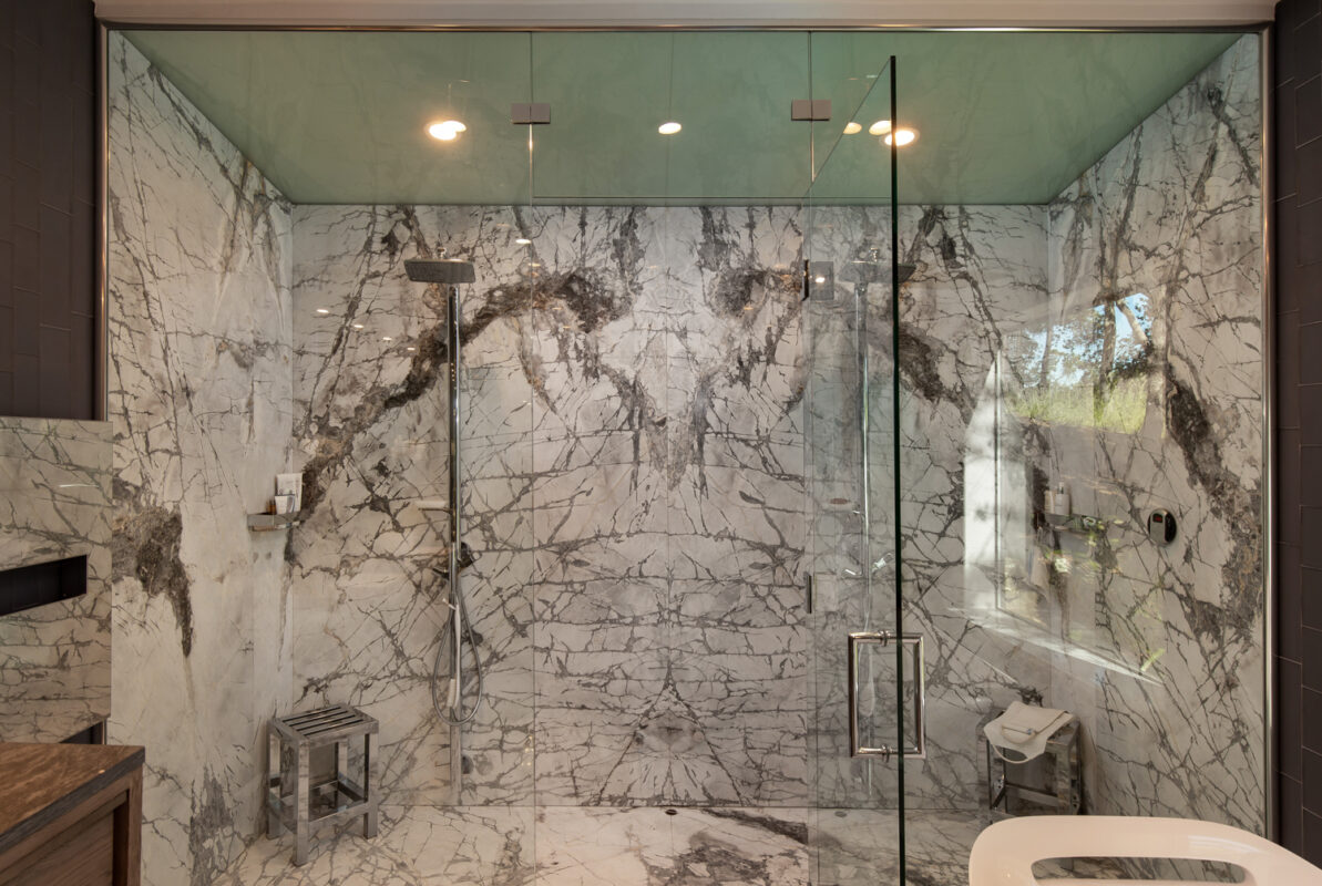 The family room, with its two-story ceiling and dimensional linear wood tile appointments, is the ideal place to relax every day. Unique appointments continue in the three half-baths, each designed with an array of finishes that include walnut, wavy tile, mirror, and marble. For those who work from home, this house is perfectly suited with two well-appointed offices. Personal accommodations comprise four spacious bedrooms, including a multi-room suite with flexible use and an exceptional primary suite with a sitting room, fitness center, five-star bath, and private deck with large saltwater spa.