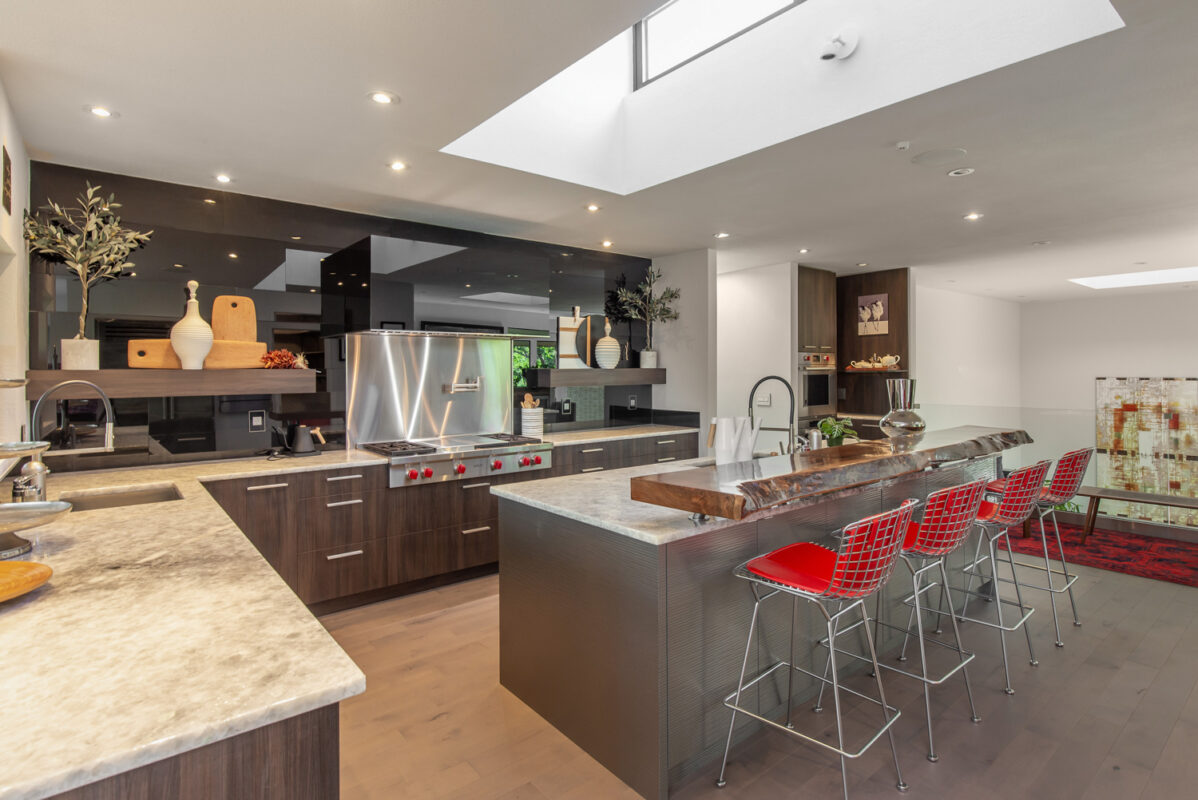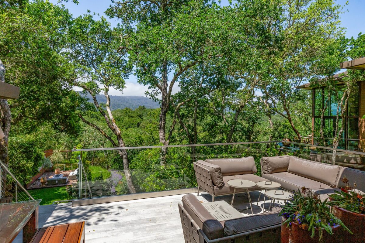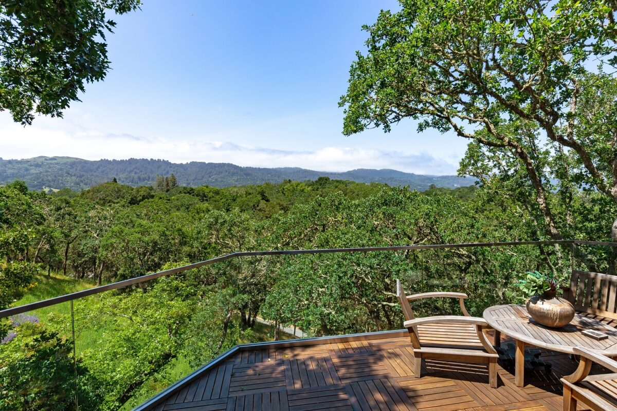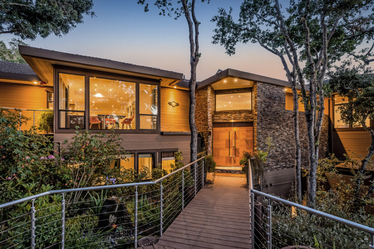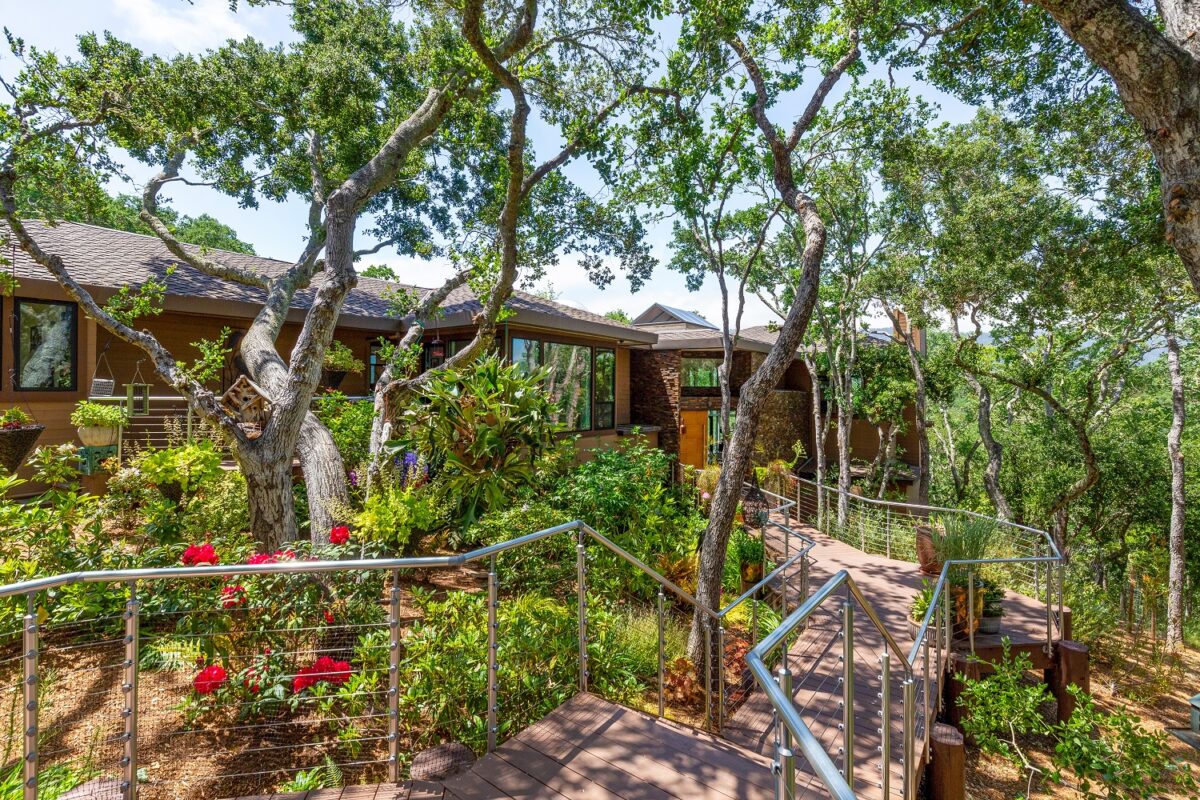 The outdoor space is a sanctuary for birds, butterflies, and anyone seeking quiet contemplation among the wildflowers and perfectly chosen foliage, inspired by South African and Australian species. Inside, the spacious floor plan revolves around a stunning central staircase with modern clear glass railings under a cathedral skylight. Entertaining is made easy with a grand two-story living room that showcases direct Windy Hill views and a dramatic fireplace feature wall made of exotic book-matched marble. A modern bar, formal dining room, customized wine cellar, and spectacular chef’s kitchen, complete with rare finishes like cross-cut onyx, black glass backsplash, and a live-edge walnut slab island counter, cater to gatherings of any size.