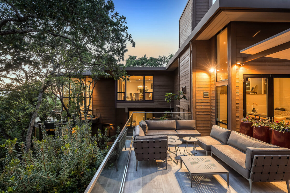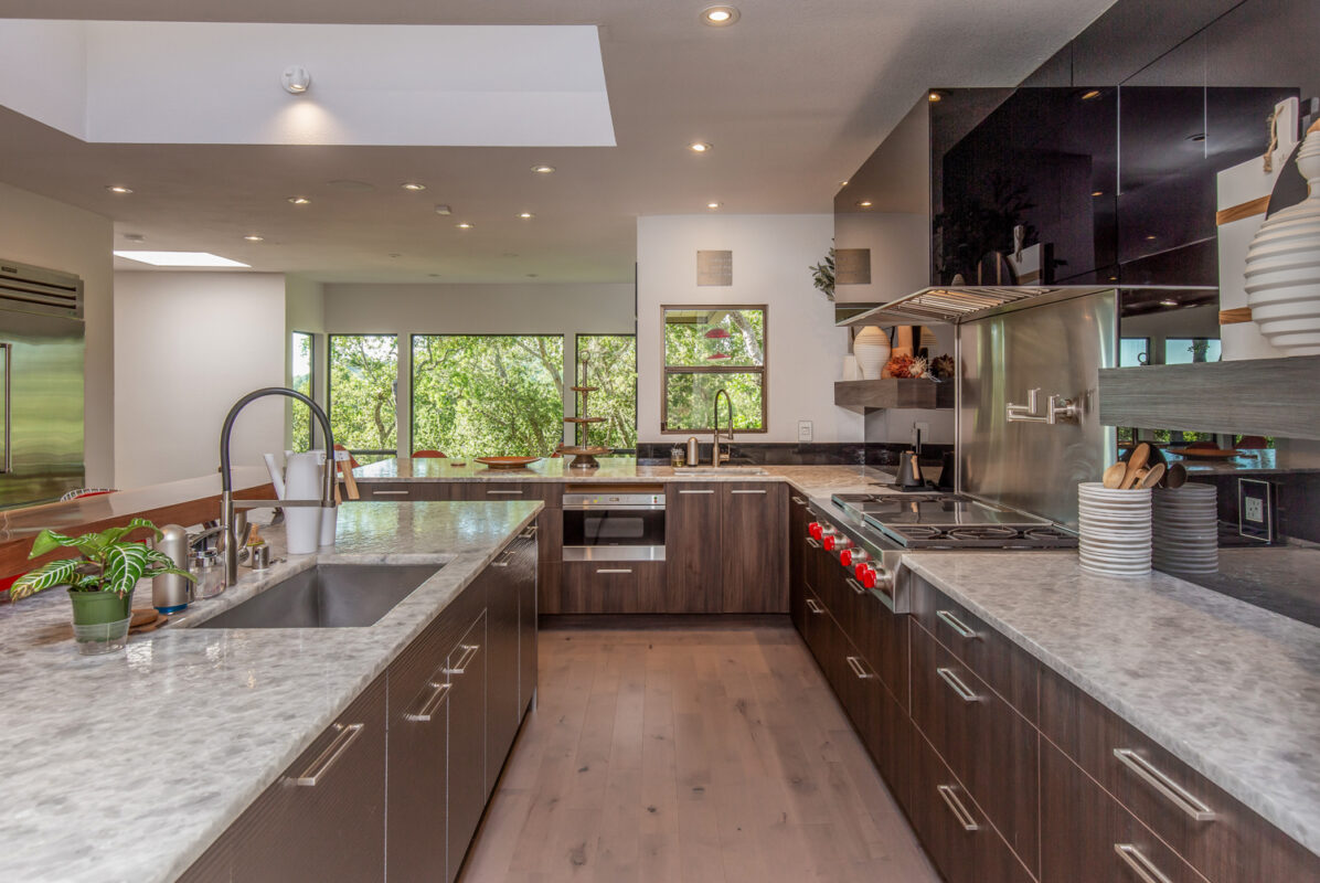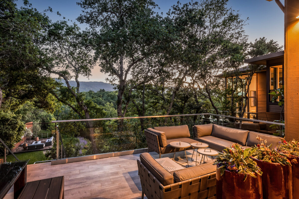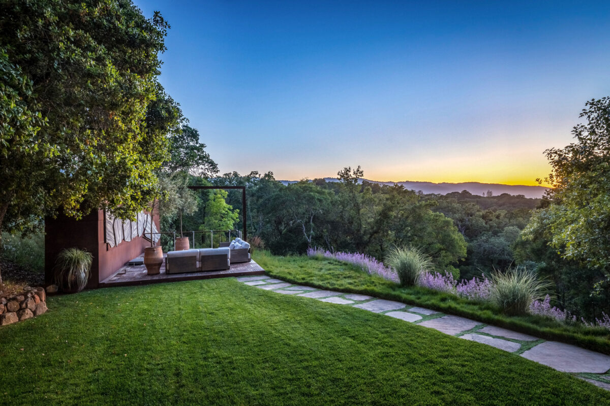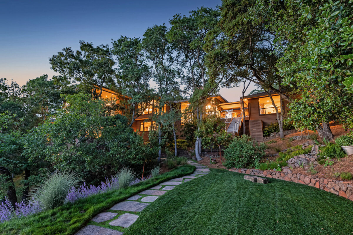 The outdoor space is a sanctuary for birds, butterflies, and anyone seeking quiet contemplation among the wildflowers and perfectly chosen foliage, inspired by South African and Australian species. Inside, the spacious floor plan revolves around a stunning central staircase with modern clear glass railings under a cathedral skylight. Entertaining is made easy with a grand two-story living room that showcases direct Windy Hill views and a dramatic fireplace feature wall made of exotic book-matched marble. A modern bar, formal dining room, customized wine cellar, and spectacular chef’s kitchen, complete with rare finishes like cross-cut onyx, black glass backsplash, and a live-edge walnut slab island counter, cater to gatherings of any size.