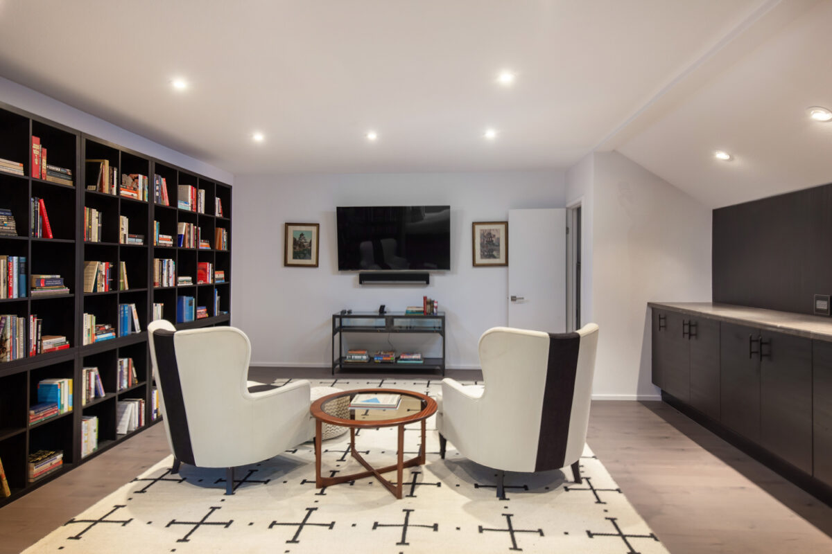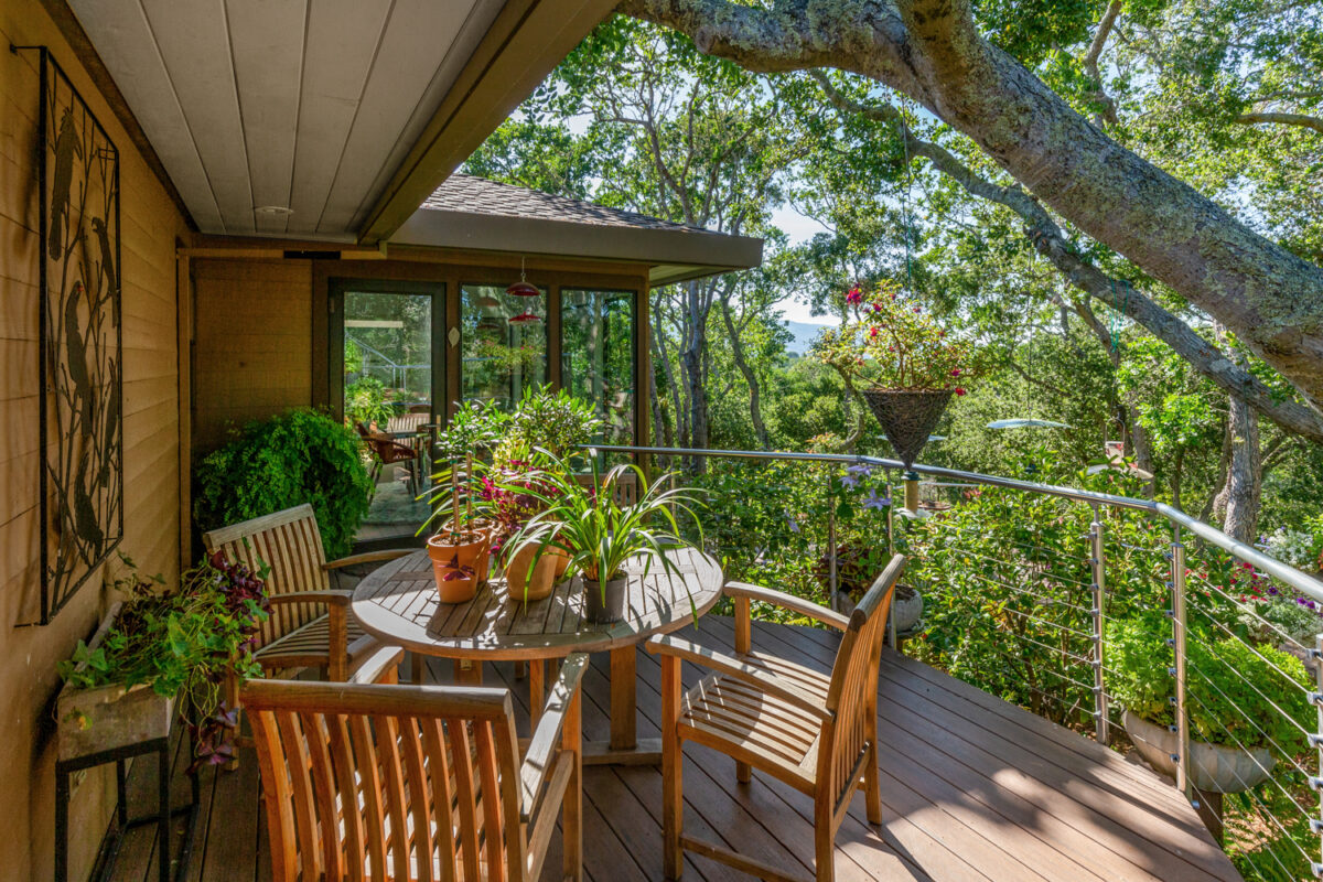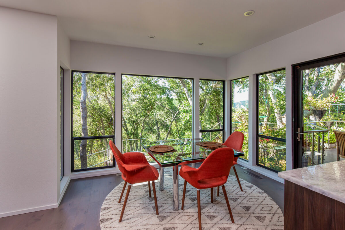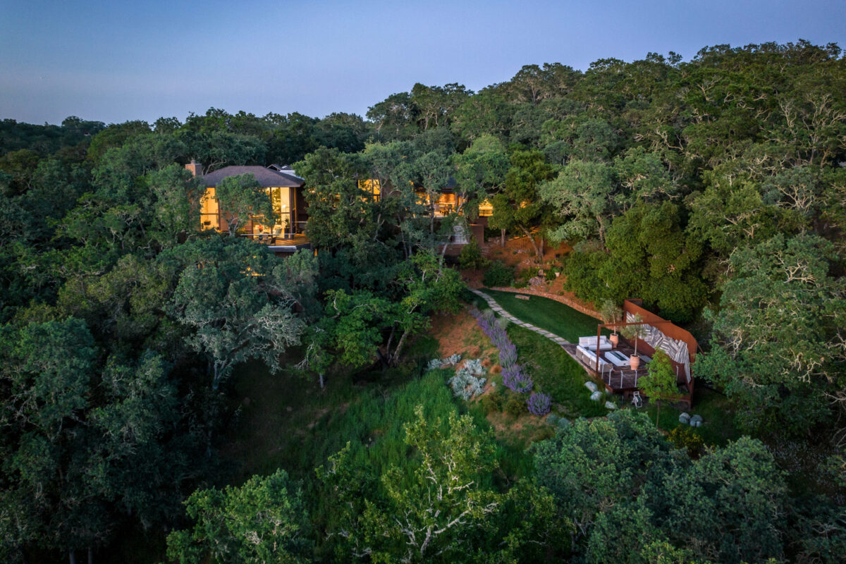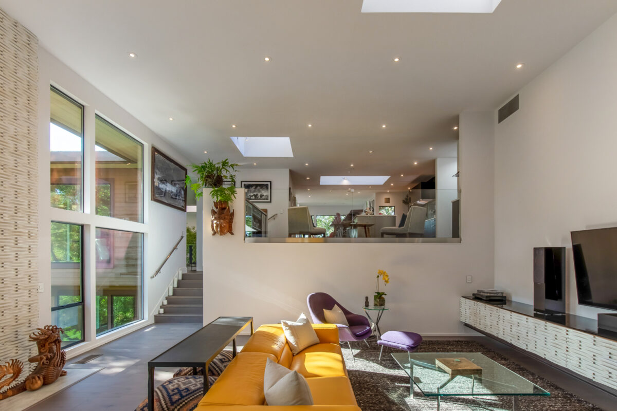 The outdoor space is a sanctuary for birds, butterflies, and anyone seeking quiet contemplation among the wildflowers and perfectly chosen foliage, inspired by South African and Australian species. Inside, the spacious floor plan revolves around a stunning central staircase with modern clear glass railings under a cathedral skylight. Entertaining is made easy with a grand two-story living room that showcases direct Windy Hill views and a dramatic fireplace feature wall made of exotic book-matched marble. A modern bar, formal dining room, customized wine cellar, and spectacular chef’s kitchen, complete with rare finishes like cross-cut onyx, black glass backsplash, and a live-edge walnut slab island counter, cater to gatherings of any size.