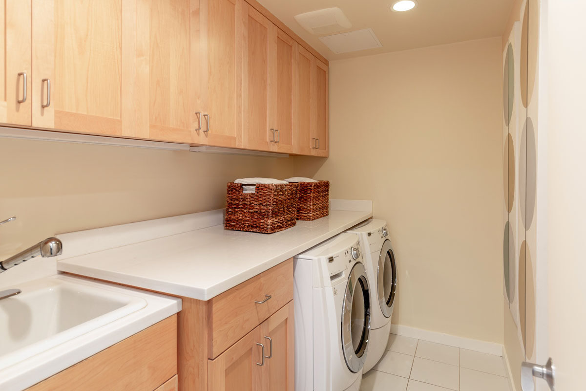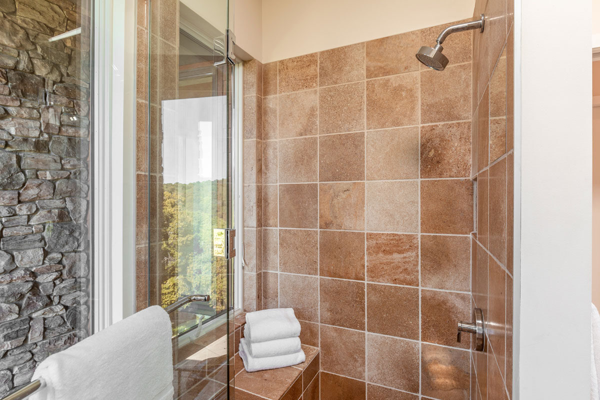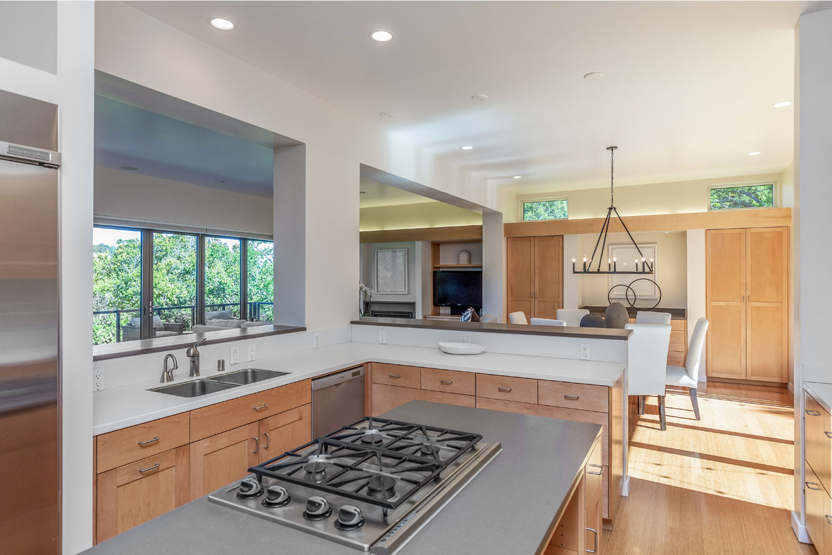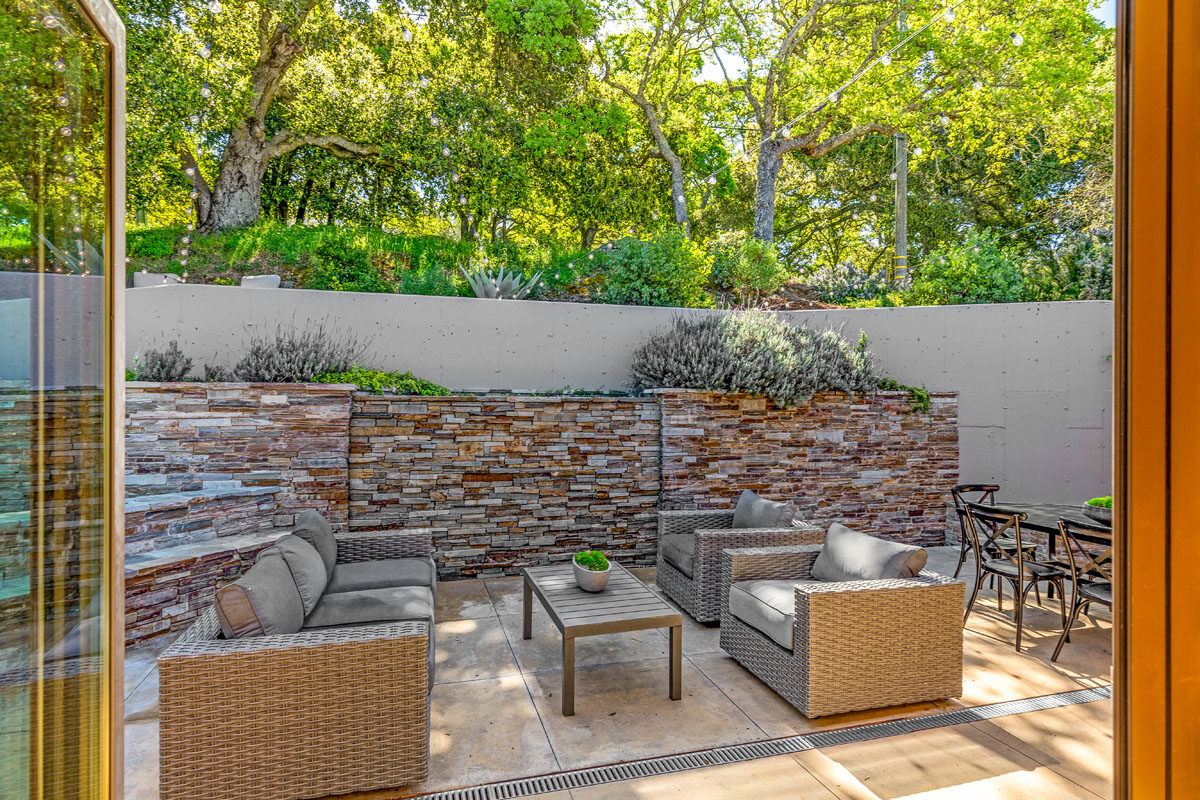 The living areas are open and flowing, further enhanced by retractable stacking glass doors at the front and rear for seamless indoor/outdoor living. Wraparound kitchen counters serve as dividers to the open space while offering seating and an easy connection with the living areas. Cabinetry throughout is maple, complemented by bamboo floors. Adding to the natural style, the home features a stunning three-story stacked stone waterfall at the front entrance. A matching stone wall featuring a second waterfall is located on the back patio, along with an integrated gas fire pit and an extra-large built-in spa for relaxation. A stepped path leads up to a seating area with sweeping views. Practical amenities include a large attached 3-car garage and a convenient service elevator connecting all levels for easily transporting groceries and packages.