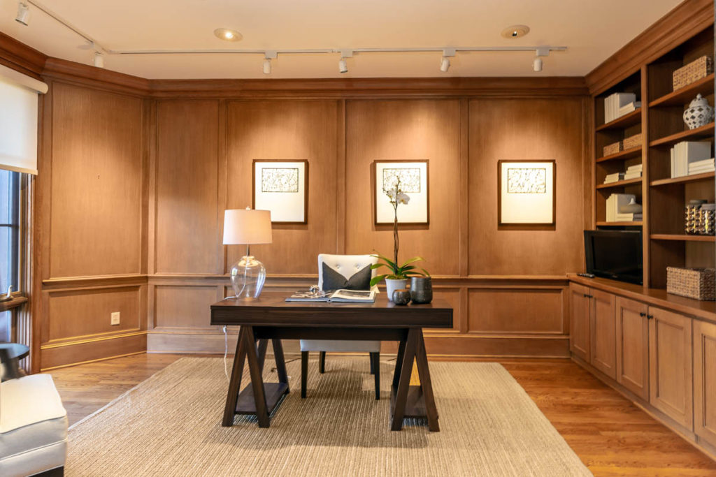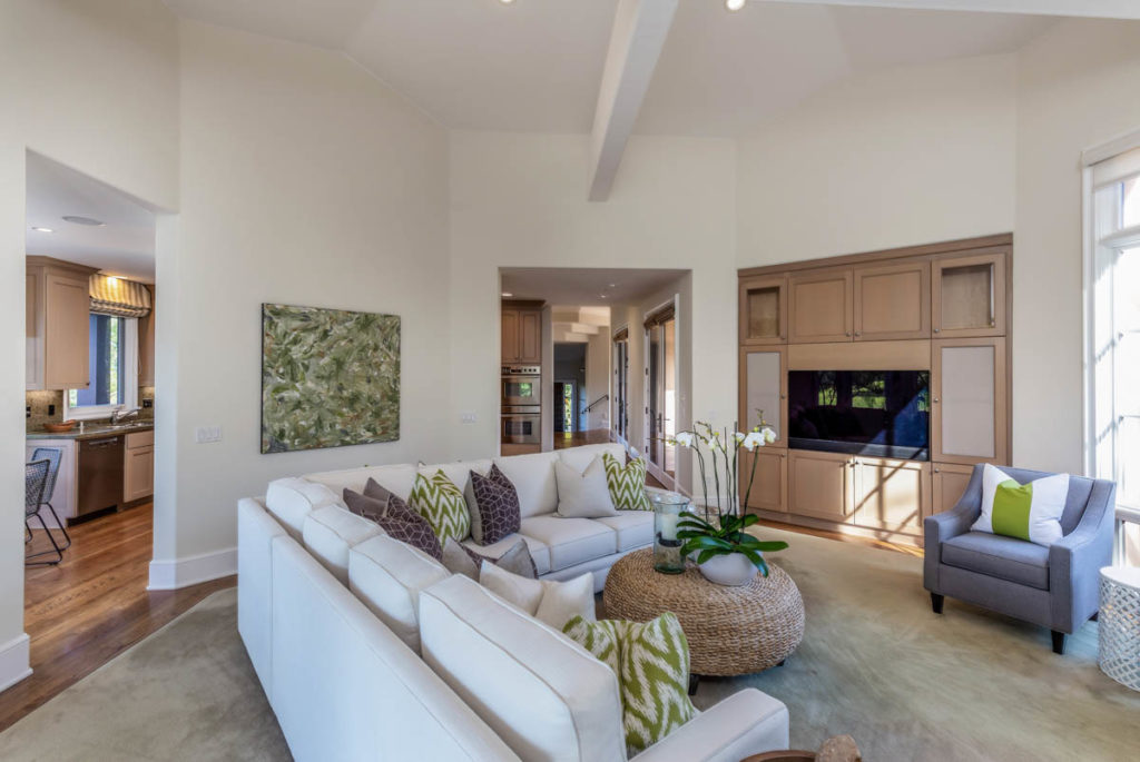 Built in 2000, the well-appointed home features graceful levels that connect the foyer and office, with a grand formal living room, and up again to all other rooms on one main level. A formal dining room is adjacent to the kitchen and family room, all bordered by a gallery hallway lined with French doors opening to the courtyard and rear area and continuing on to the bedroom wing.