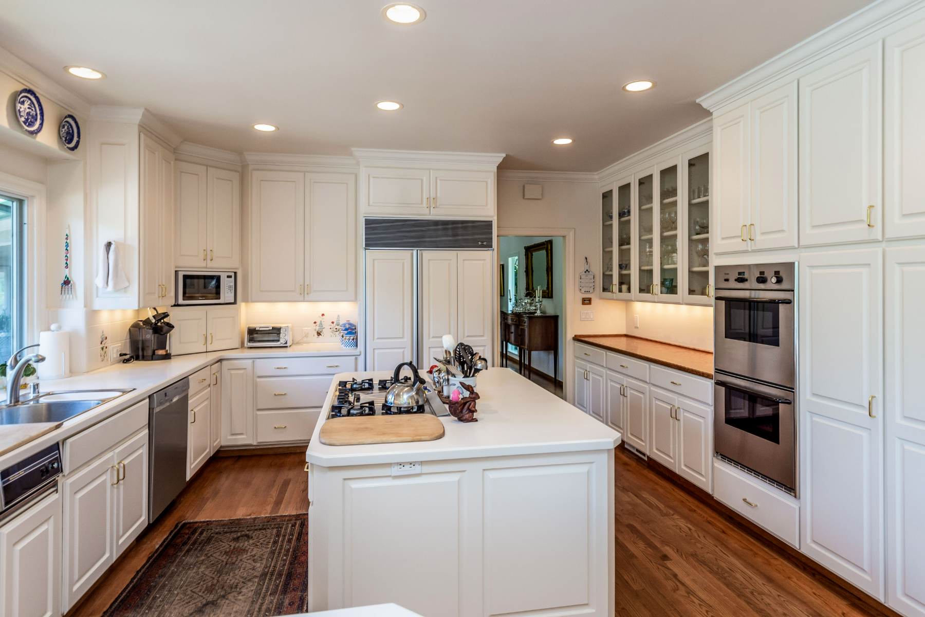 The one-level floor plan boasts to-the-floor windows and sliding glass doors at every turn opening to the magnificent surroundings. Hardwood floors and crown moldings exemplify the home’s traditional design, which includes classic formal venues for entertaining indoors or poolside. The all-white kitchen is beautifully updated with custom storage, an island with counter seating, and a large casual dining area. Adjoining it all is a spacious and open family room for extended entertaining and everyday living.