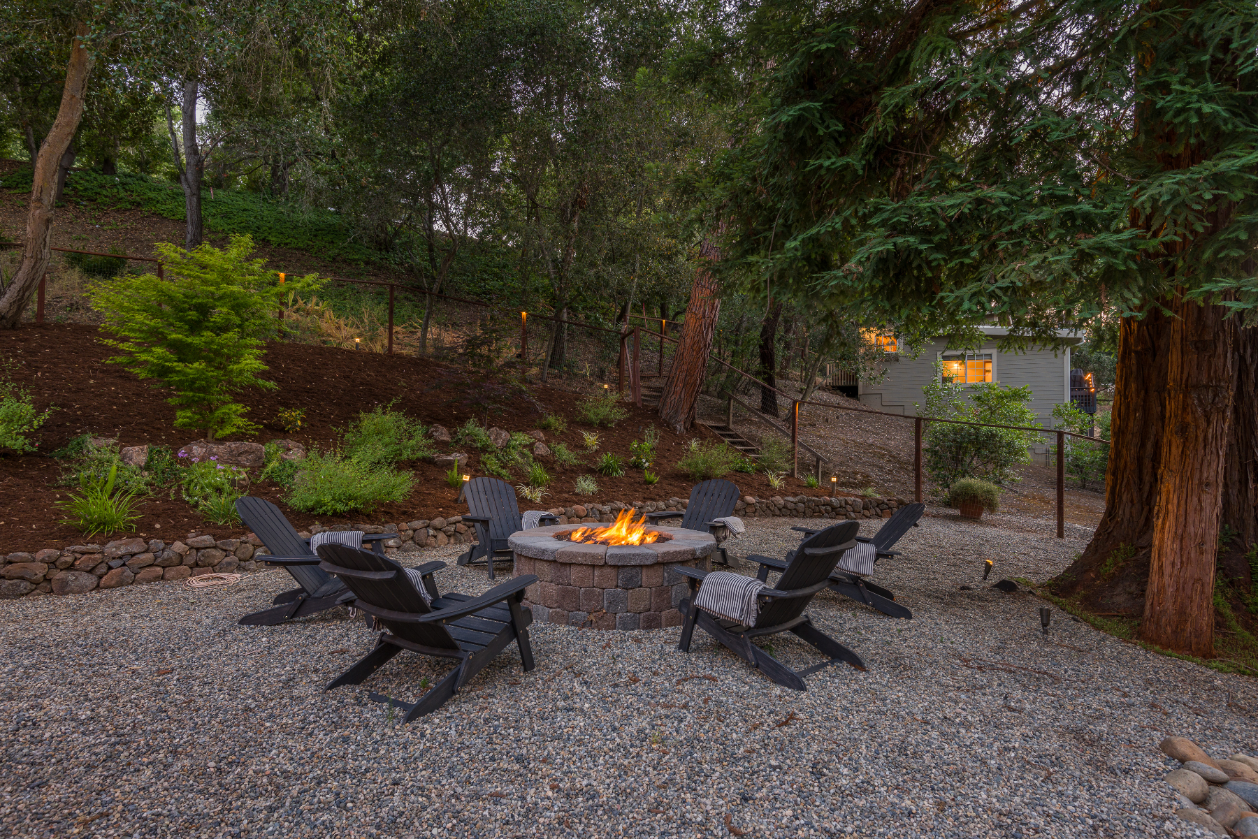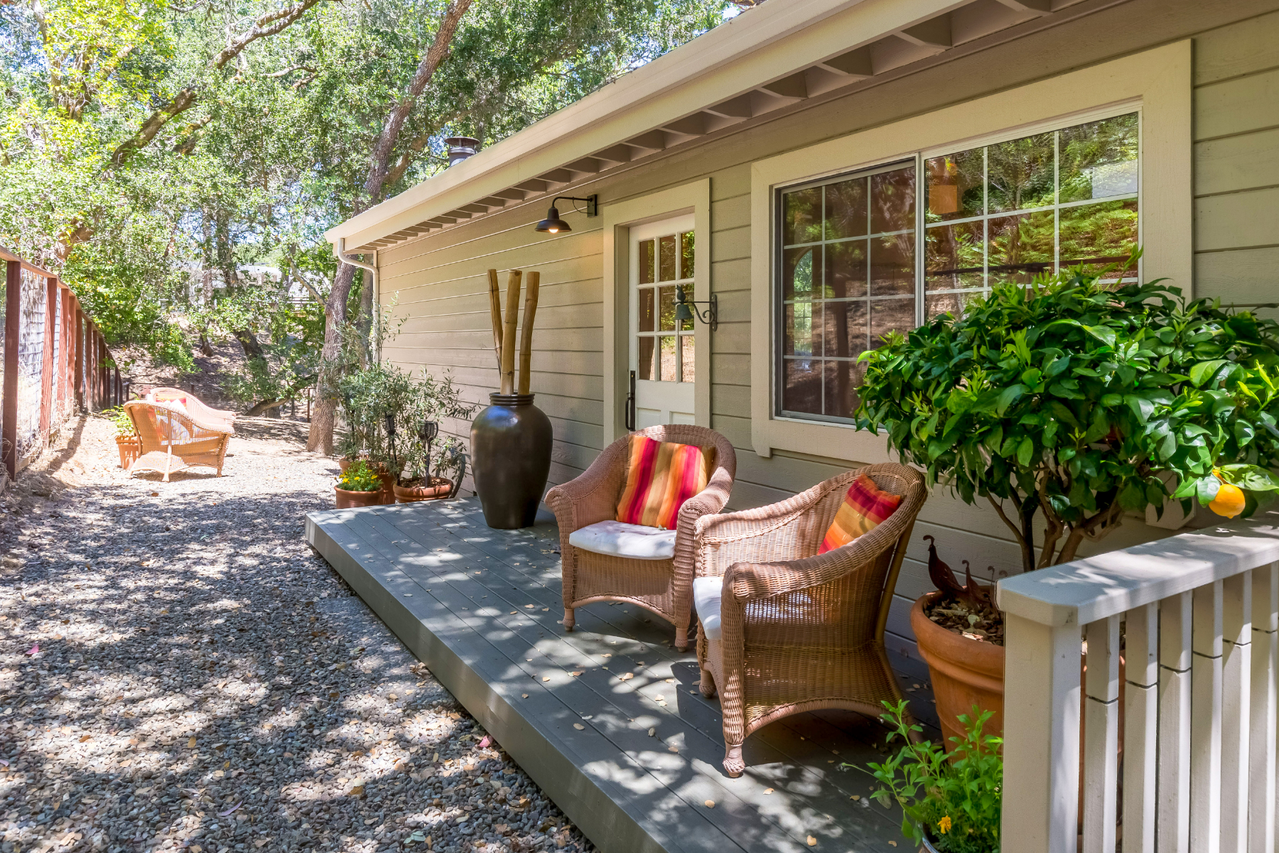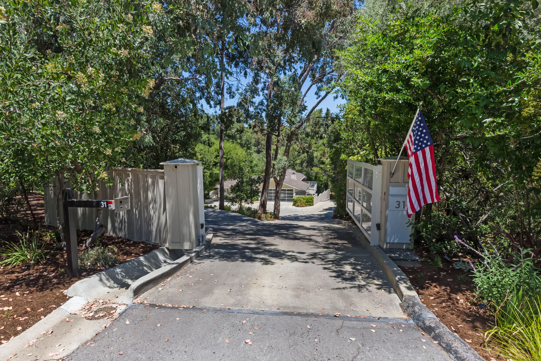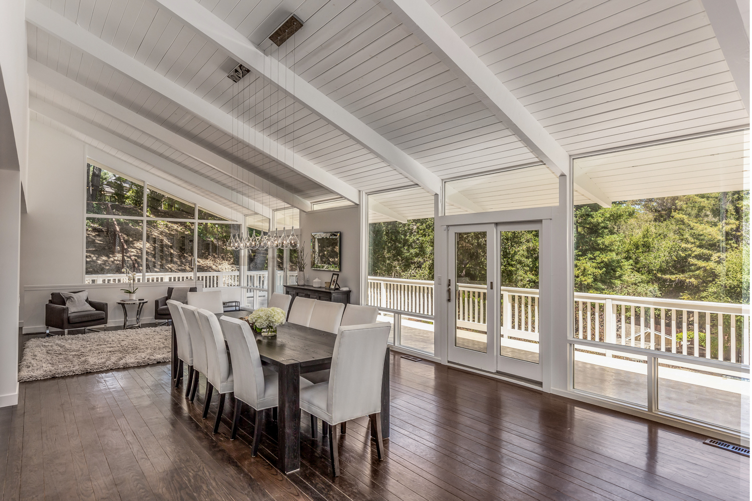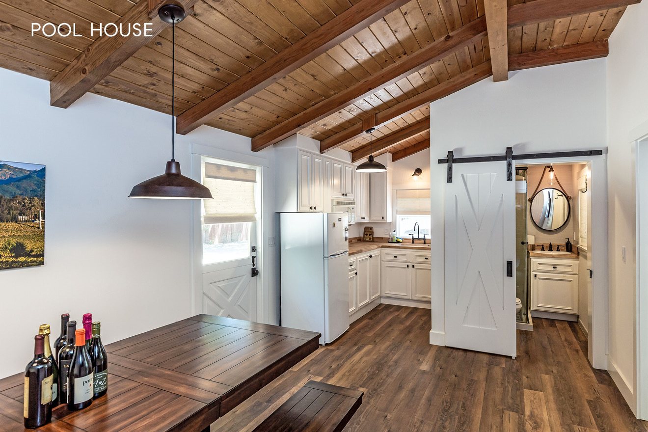 This private compound presents close-in country living combined with a whole-home remodel that is chic and stylish. The property comprises three separate living quarters on approximately 1.4 acres, offering options for a variety of lifestyles including guests, extended family, rental income, and/or home office space. From the opaque glass front gate to the all-white interiors and espresso-hued hardwood floors, the entire ambiance of the main residence is bright and contemporary. Floor-to-ceiling windows reach the peak of the cathedral ceiling that spans the main living area, which has been entirely reconfigured for an open concept design. Tear-drop glass pendants define the dining area between two lounge areas and an all-white kitchen stands ready to cater large events. The primary suite is located on the main level and features a sleek fireplace and newly remodeled five-star bath with heated floors plus a tremendous wardrobe room. Clear-glass railings frame the staircase to the upper level, which includes two additional bedrooms, each opening to a large shared deck, plus a remodeled bath also with heated floor.