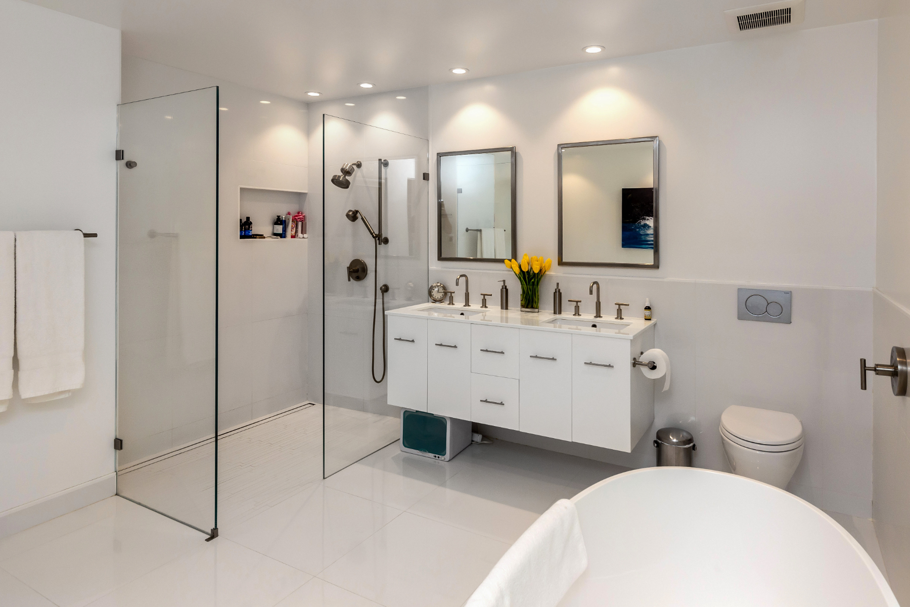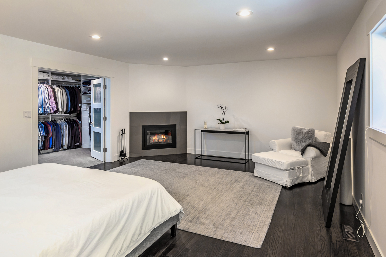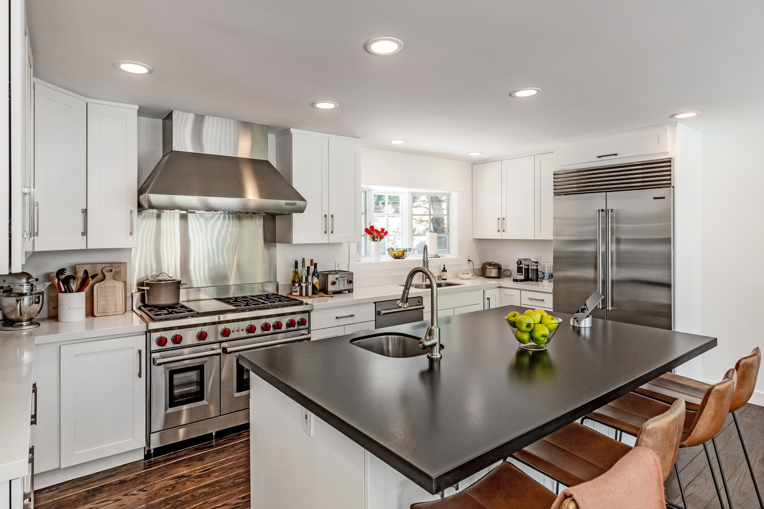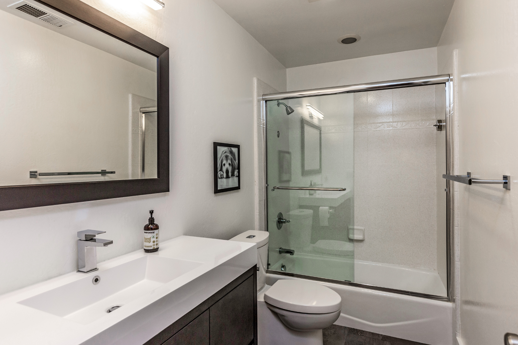 This private compound presents close-in country living combined with a whole-home remodel that is chic and stylish. The property comprises three separate living quarters on approximately 1.4 acres, offering options for a variety of lifestyles including guests, extended family, rental income, and/or home office space. From the opaque glass front gate to the all-white interiors and espresso-hued hardwood floors, the entire ambiance of the main residence is bright and contemporary. Floor-to-ceiling windows reach the peak of the cathedral ceiling that spans the main living area, which has been entirely reconfigured for an open concept design. Tear-drop glass pendants define the dining area between two lounge areas and an all-white kitchen stands ready to cater large events. The primary suite is located on the main level and features a sleek fireplace and newly remodeled five-star bath with heated floors plus a tremendous wardrobe room. Clear-glass railings frame the staircase to the upper level, which includes two additional bedrooms, each opening to a large shared deck, plus a remodeled bath also with heated floor.