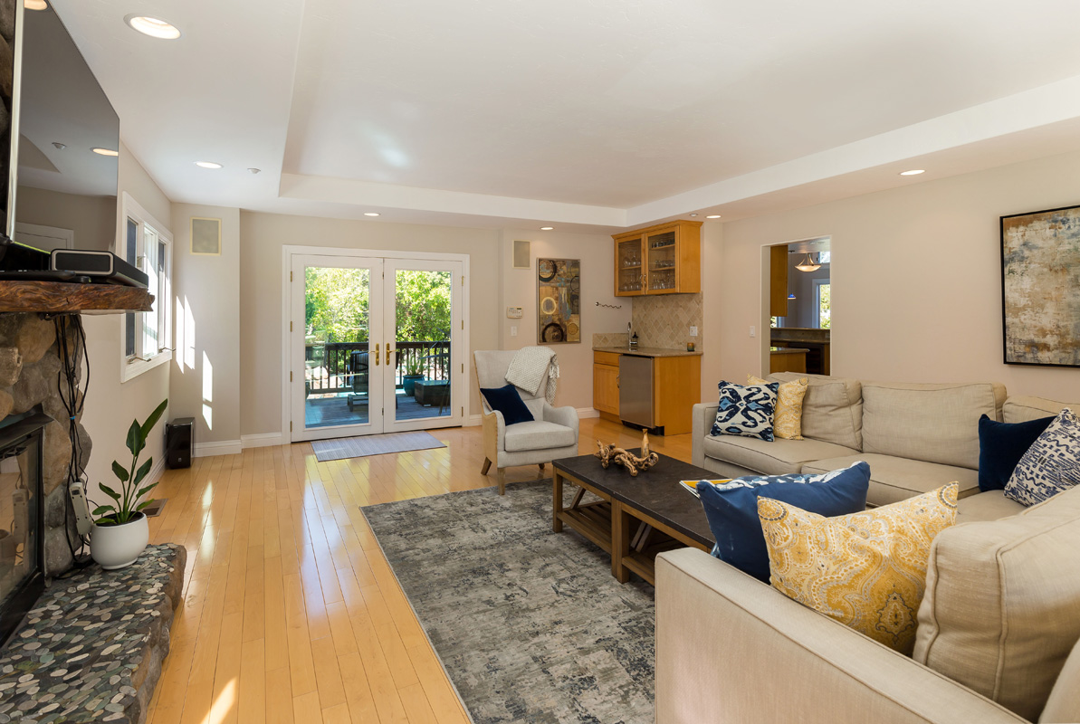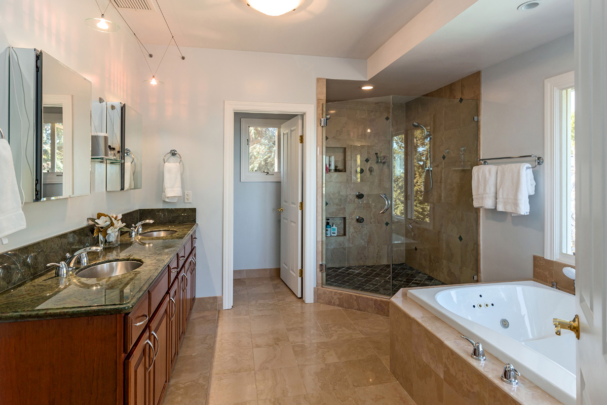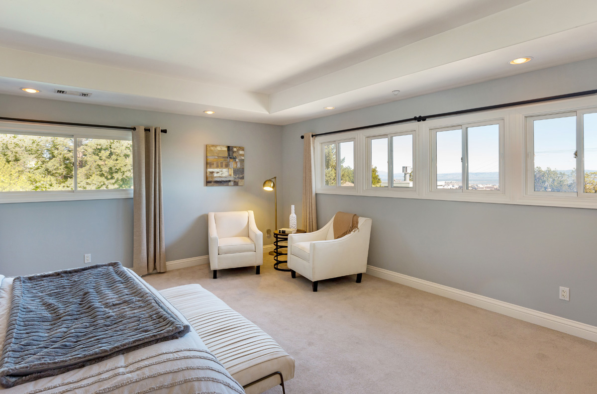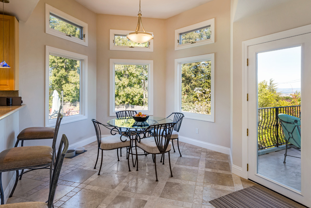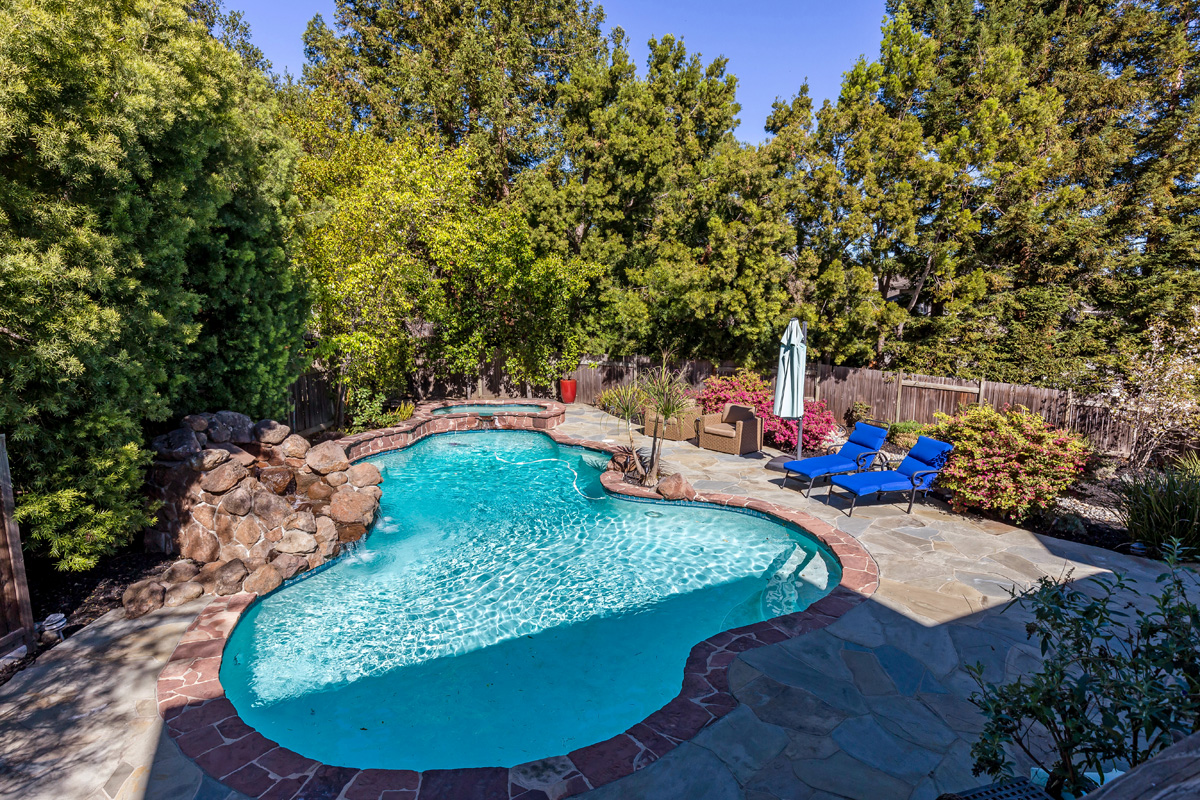 Situated on a 14,080 square-foot lot, this property affords plentiful amenities, including a landscaped terraced yard, pool with spa and rock waterfall, multiple decks for entertaining, and a large lawn. The home’s interiors are especially light and spacious featuring picture windows in the dining and living rooms offering a serene view of the SF Bay. The spacious kitchen with eating nook connects to a balcony overlooking the pool area. Finally, the vast family room, with its flanking patio doors, enjoys views of both the pool and the back deck and lawn areas.