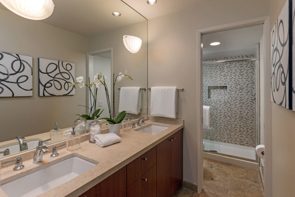Lower level; dual sink vanity with granite counter and stone tile floor; large stall shower with sliding glass door and stone tile surround