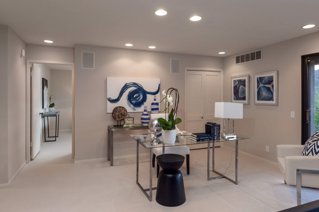Tray ceiling with custom plaster finish matching living room fireplace; sliding glass door to side deck; built-in custom mahogany veneer credenza with black leather finish granite countertop separates dining room from kitchen; custom mahogany veneer beverage center with 100 bottle Miele wine cooler and black leather finish granite counter
