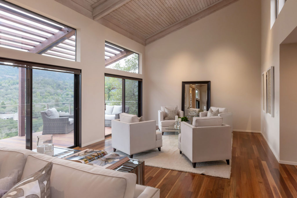 Open-beam vaulted ceiling with halogen lighting, sliding glass doors to deck with transom windows above; wood-burning fireplace with custom plaster surround and raised granite hearth