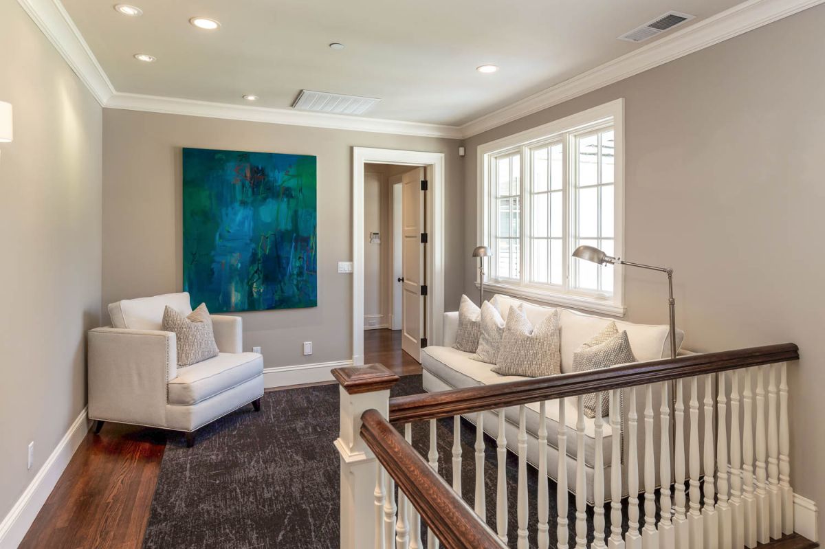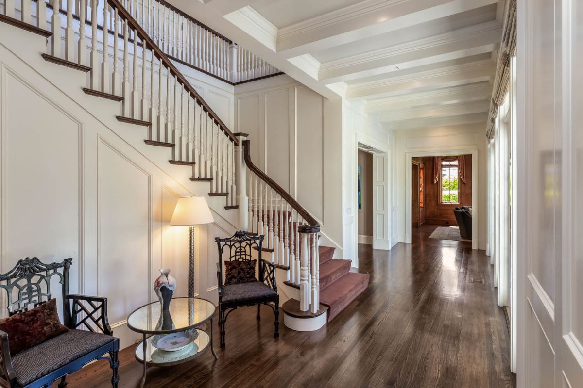 This exceptional estate is a masterpiece of East Coast-influenced architecture with classic shuttered windows and steeply pitched rooflines. Built in 2008 by renowned builder Joe Comartin, Woodlane Properties, the home spans three levels with more than 10,500 square feet of absolute luxury. Signature construction details abound, including multiple Rumford-style fireplaces, gorgeous hardwood floors, some in a herringbone pattern, and perfectly selected lighting with art in mind. Varied ceiling architecture and finely crafted millwork accentuate the feeling of a Hamptons home, while discreetly integrated technology behind the scenes fulfills the most contemporary expectations for Silicon Valley living.