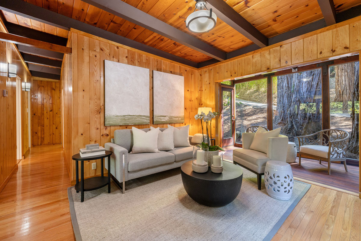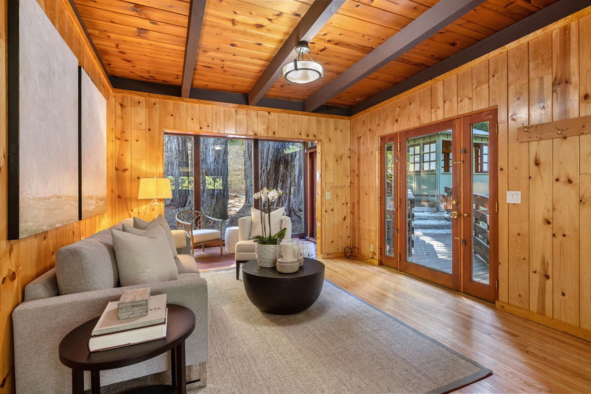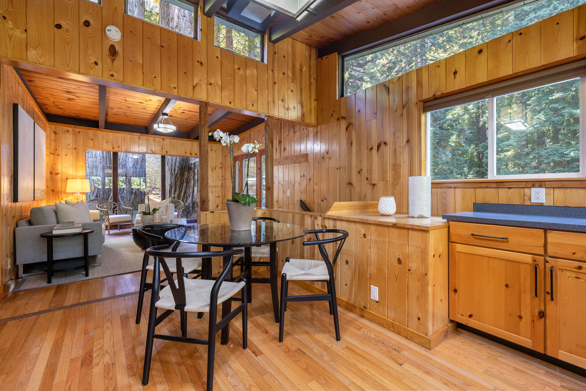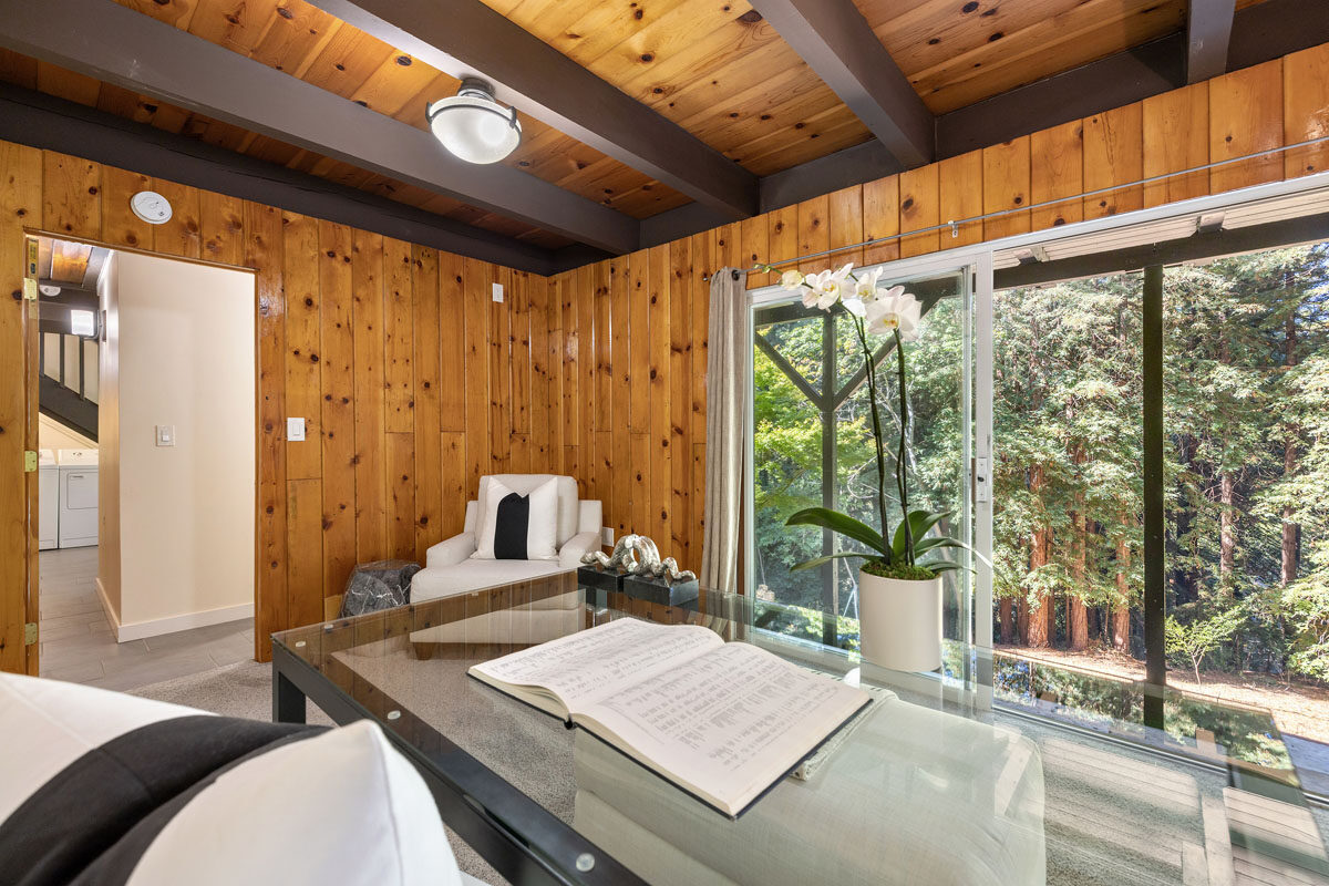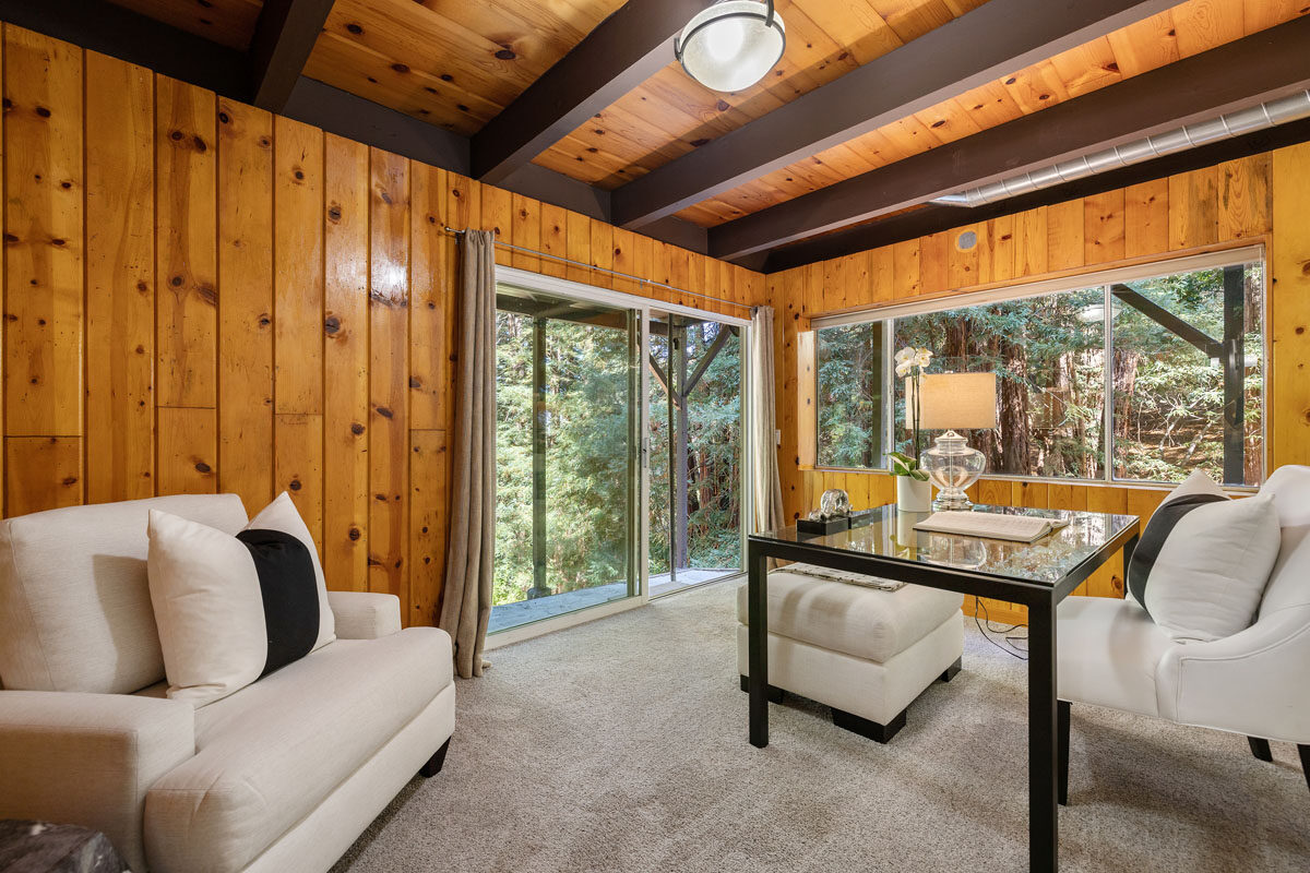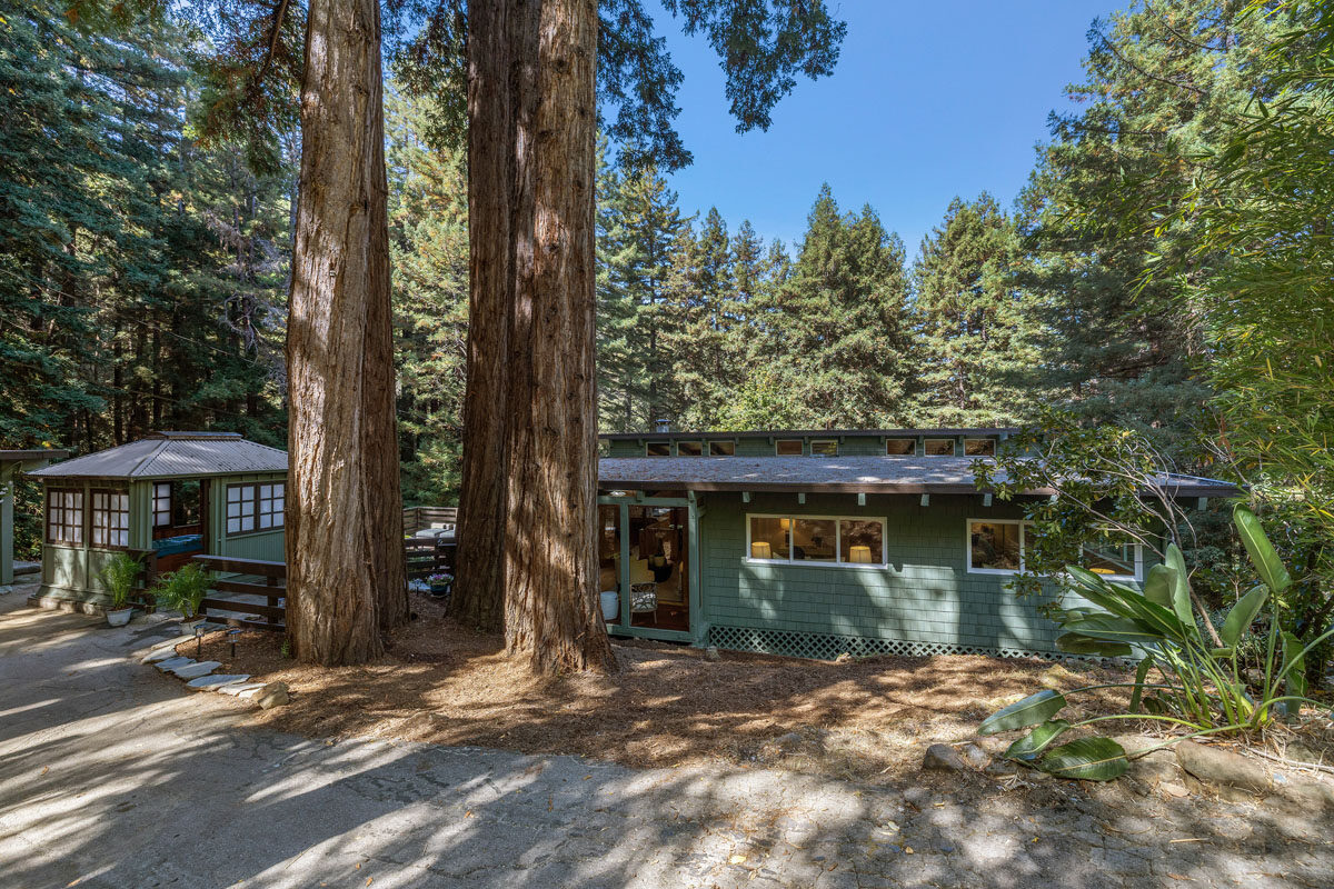 Inside, discover the rustic charm of this 3-bedroom plus office, 3-bath home adorned with pine wood on walls and ceilings, and hardwood floors in most rooms. The welcoming great room, flooded with natural light from clerestory windows and a glass-lined front alcove, seamlessly combines living, dining, and the kitchen. The main level has three bedrooms, including a primary suite with sweeping views of the redwoods and deck access. The fourth bedroom, with its own entrance, and a bath are on the lower level, along with a spacious project/laundry room. Added conveniences include a detached 2-car garage, plus access to acclaimed Woodside Elementary (K-8) School just over 2 miles away.