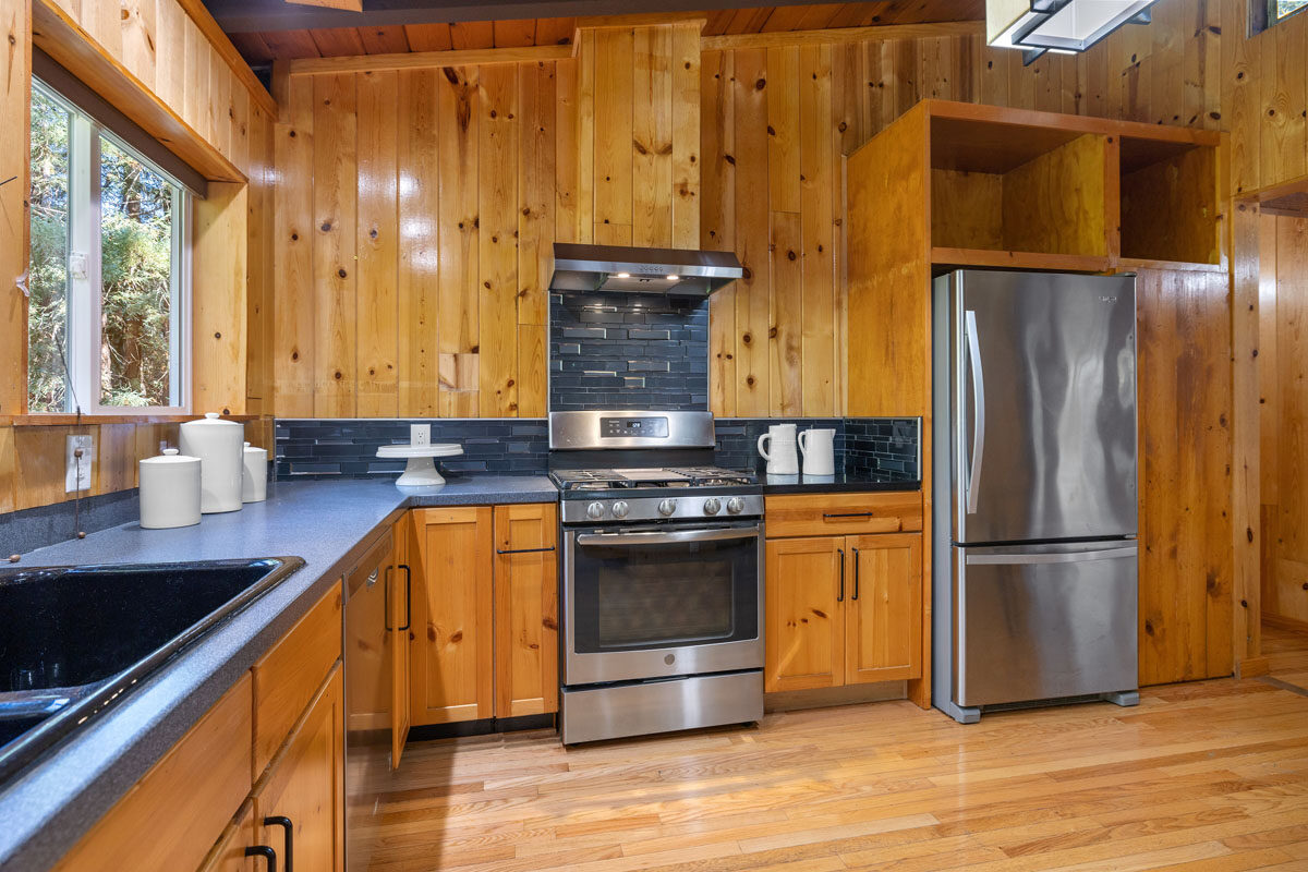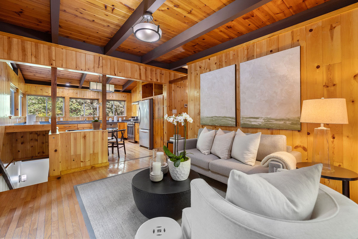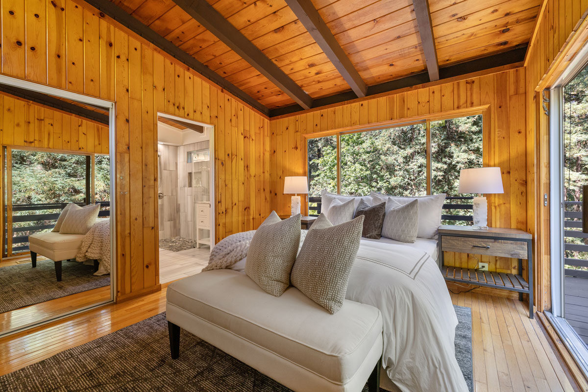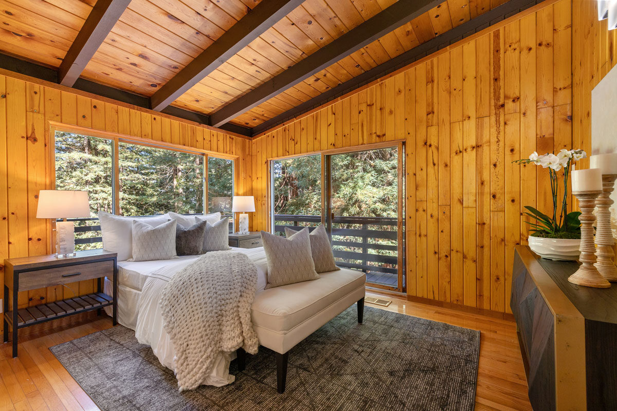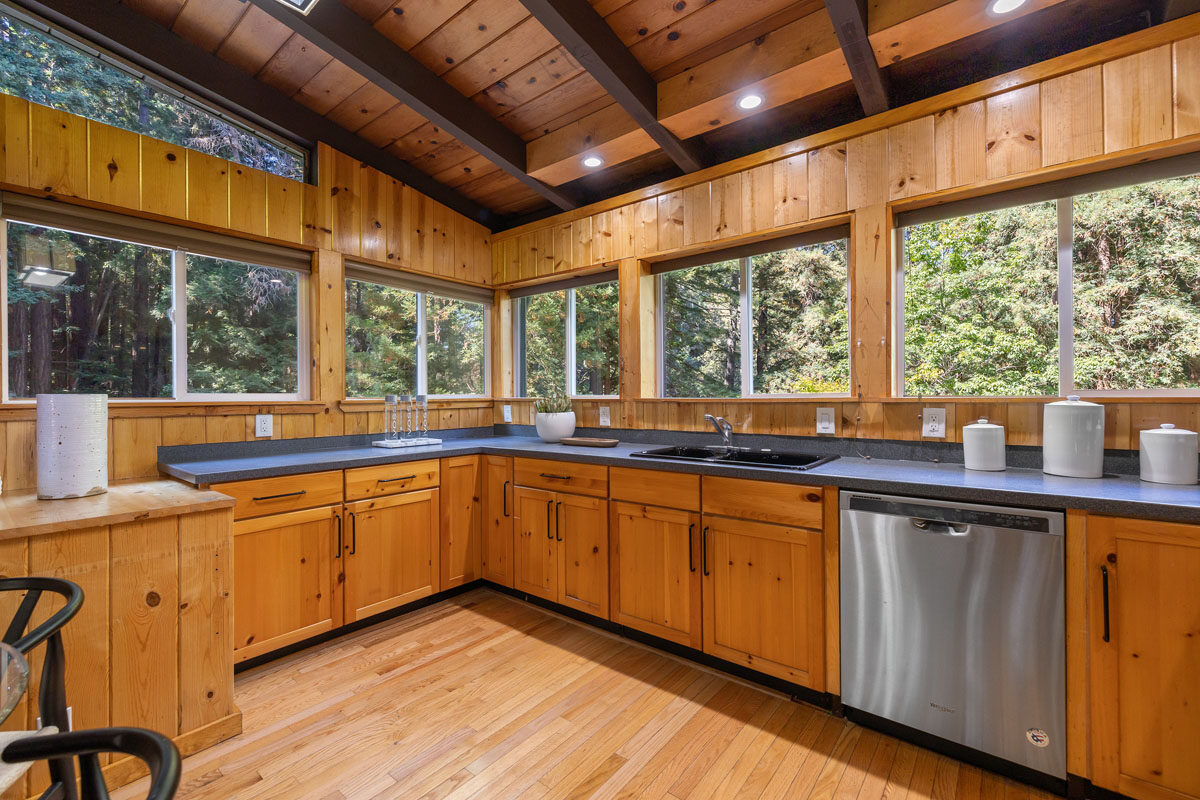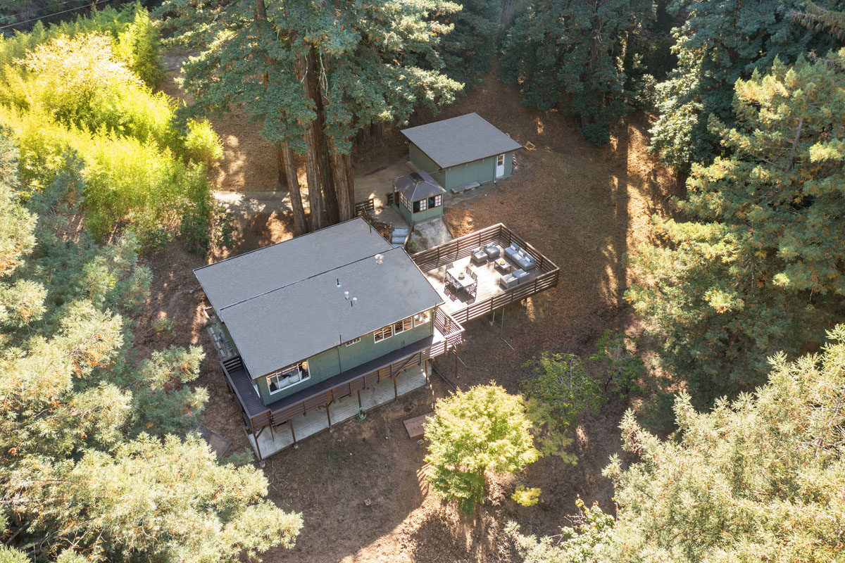 Inside, discover the rustic charm of this 3-bedroom plus office, 3-bath home adorned with pine wood on walls and ceilings, and hardwood floors in most rooms. The welcoming great room, flooded with natural light from clerestory windows and a glass-lined front alcove, seamlessly combines living, dining, and the kitchen. The main level has three bedrooms, including a primary suite with sweeping views of the redwoods and deck access. The fourth bedroom, with its own entrance, and a bath are on the lower level, along with a spacious project/laundry room. Added conveniences include a detached 2-car garage, plus access to acclaimed Woodside Elementary (K-8) School just over 2 miles away.