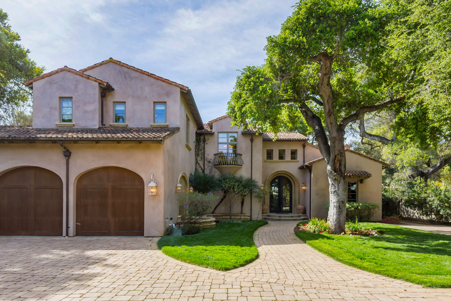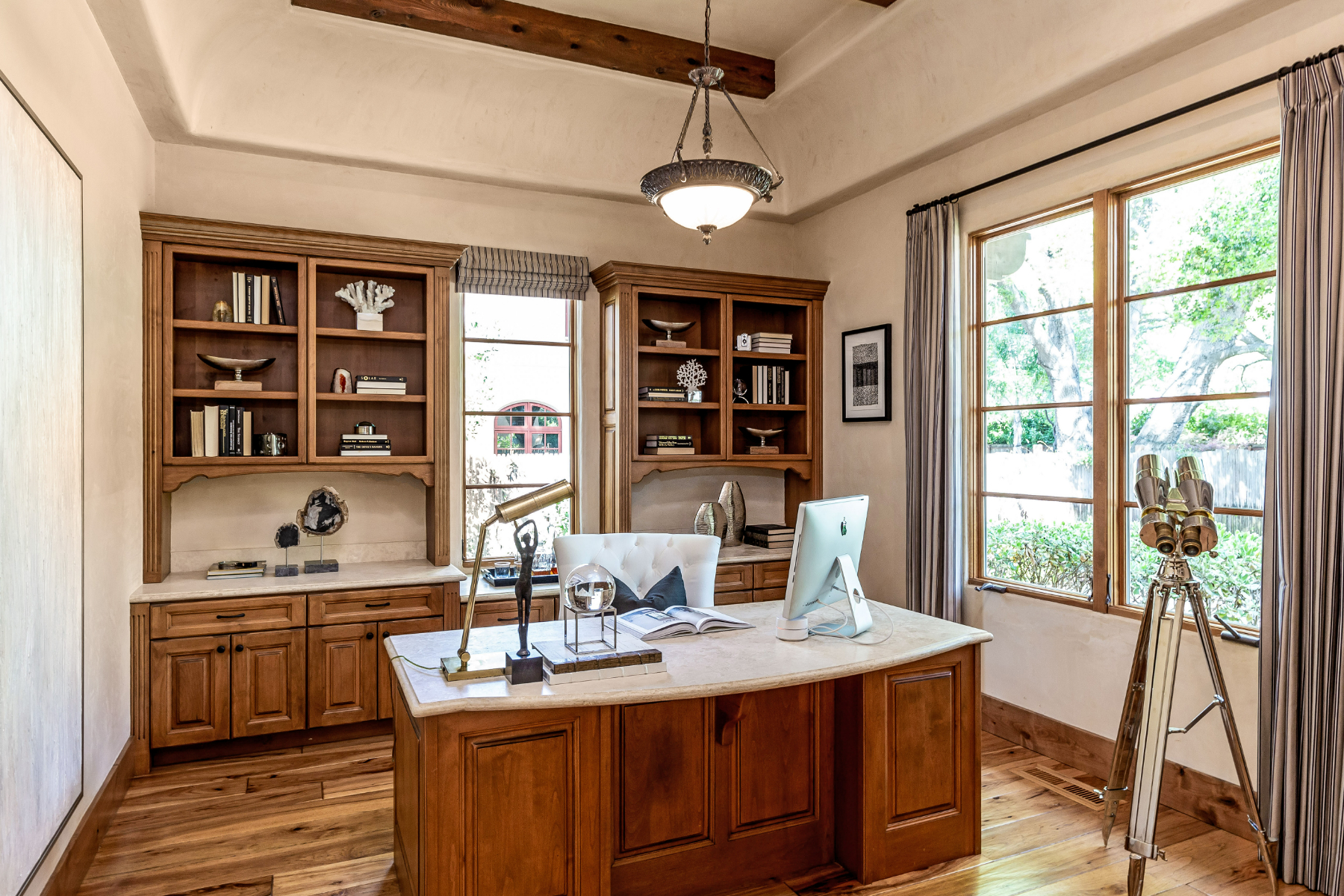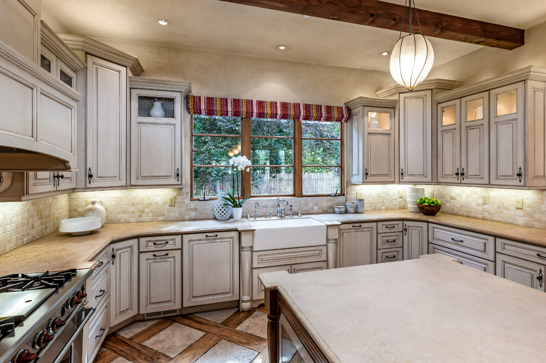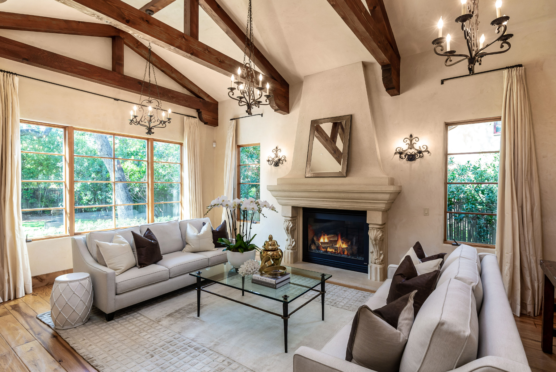 Set back from the street in complete privacy beyond a gated driveway, this impressive home presents a Tuscan ambiance in the sought-after Menlo Oaks neighborhood. Presiding over beautiful grounds of just over one-half acre with a majestic heritage oak, the home’s architecture is classic European with tiled roof, arched doorways, and a richly hued palette accented with wrought iron railings and copper gutters. A warm and inviting atmosphere begins at the front door, which opens to interiors finished with timeless beauty, plastered walls with a subtle faux finish, and distressed hickory or travertine floors. Architectural vaulted ceilings are signatures of many rooms, each with exposed beams and perfectly selected lighting.