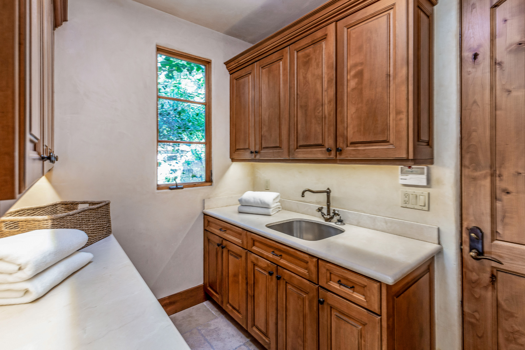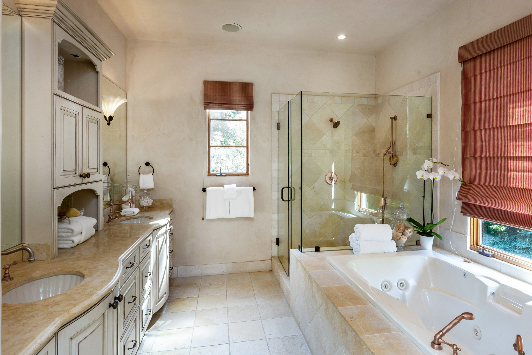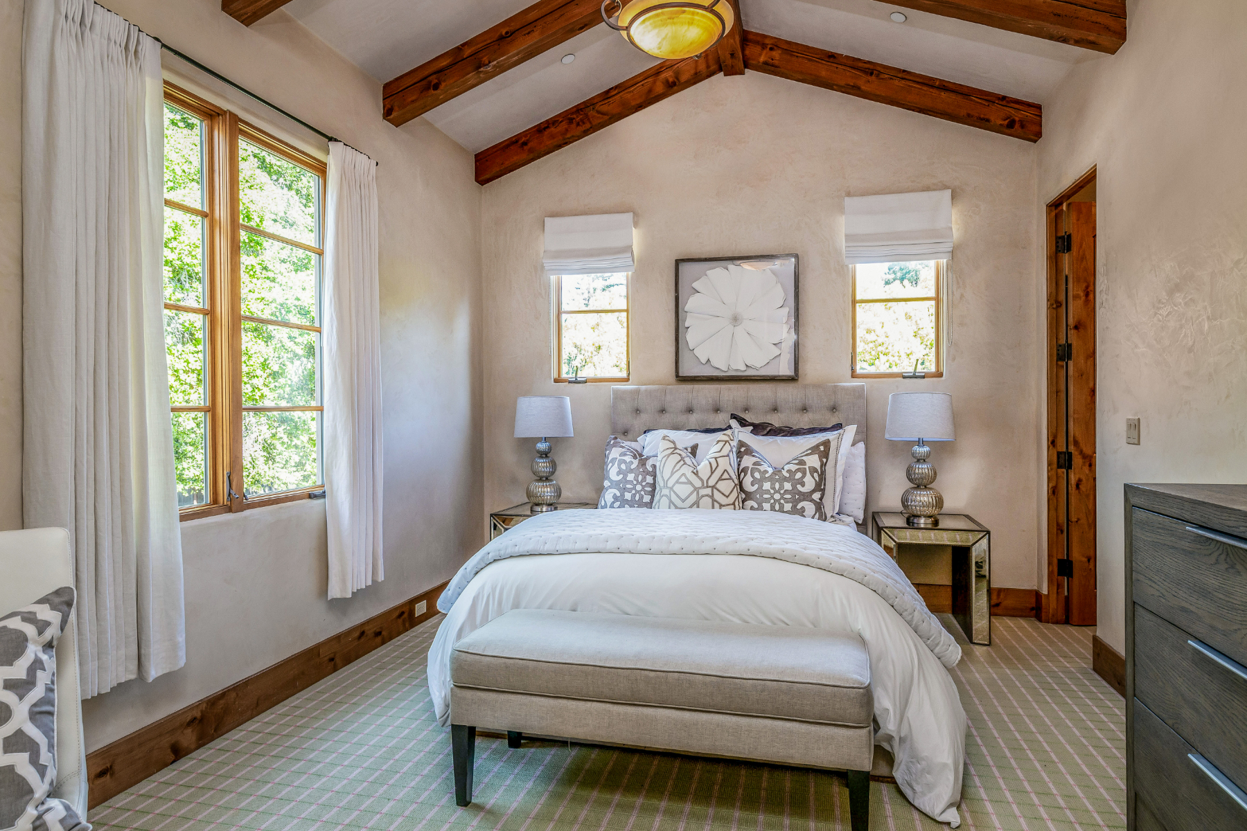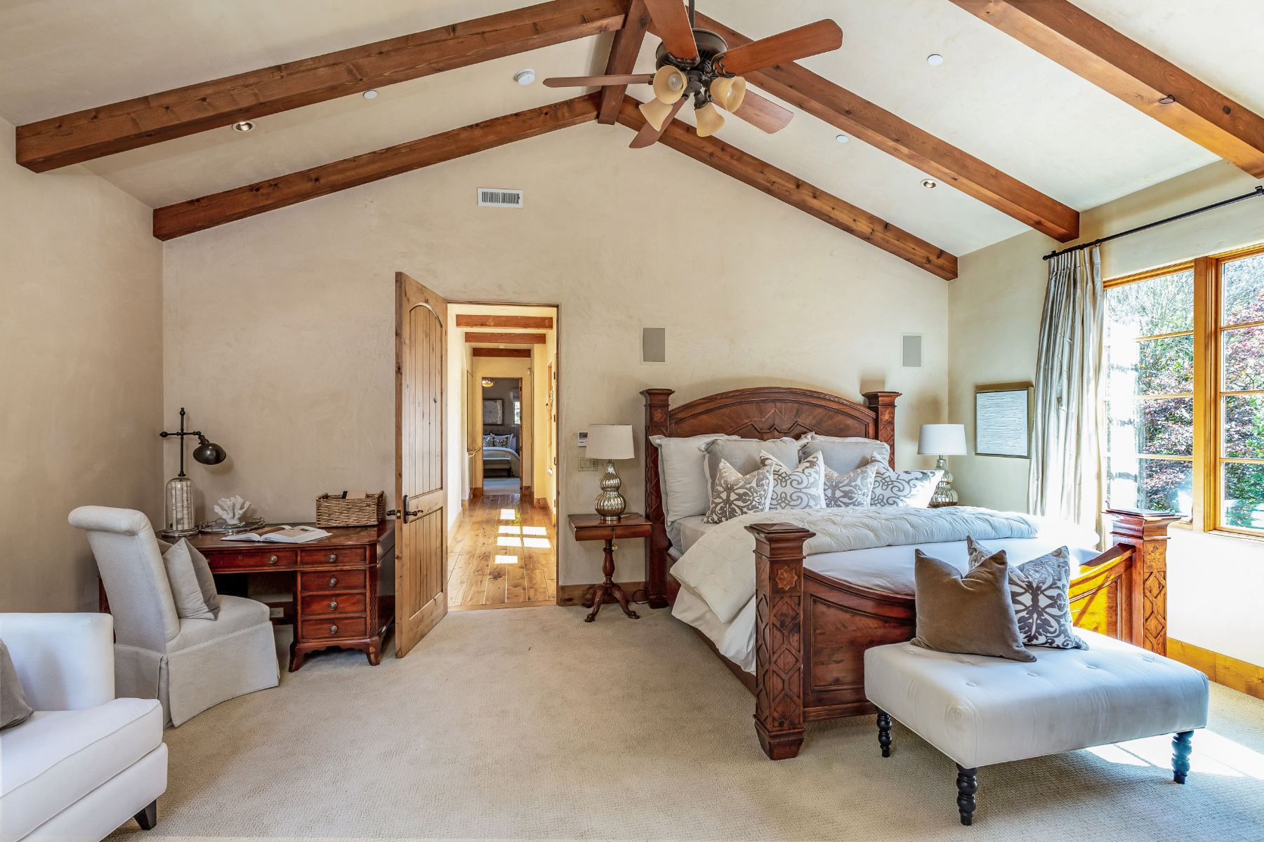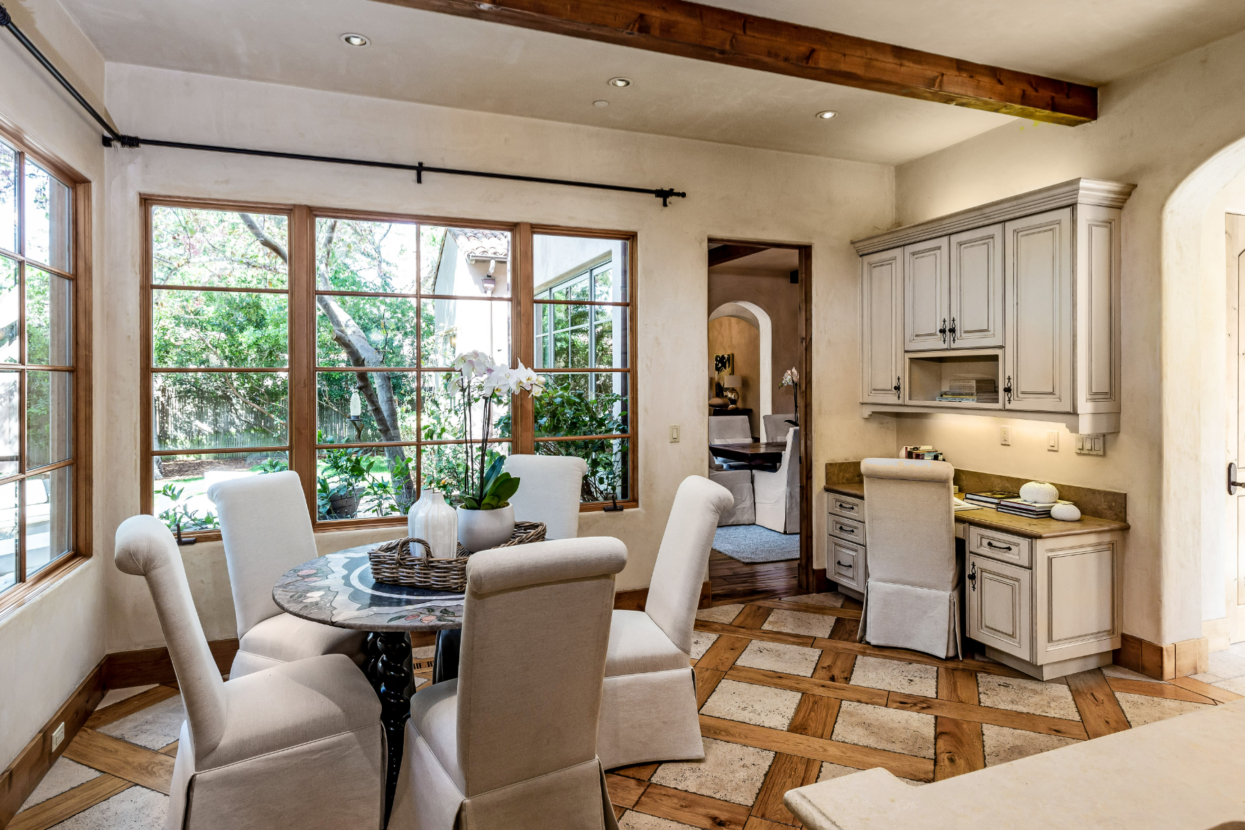 Set back from the street in complete privacy beyond a gated driveway, this impressive home presents a Tuscan ambiance in the sought-after Menlo Oaks neighborhood. Presiding over beautiful grounds of just over one-half acre with a majestic heritage oak, the home’s architecture is classic European with tiled roof, arched doorways, and a richly hued palette accented with wrought iron railings and copper gutters. A warm and inviting atmosphere begins at the front door, which opens to interiors finished with timeless beauty, plastered walls with a subtle faux finish, and distressed hickory or travertine floors. Architectural vaulted ceilings are signatures of many rooms, each with exposed beams and perfectly selected lighting.